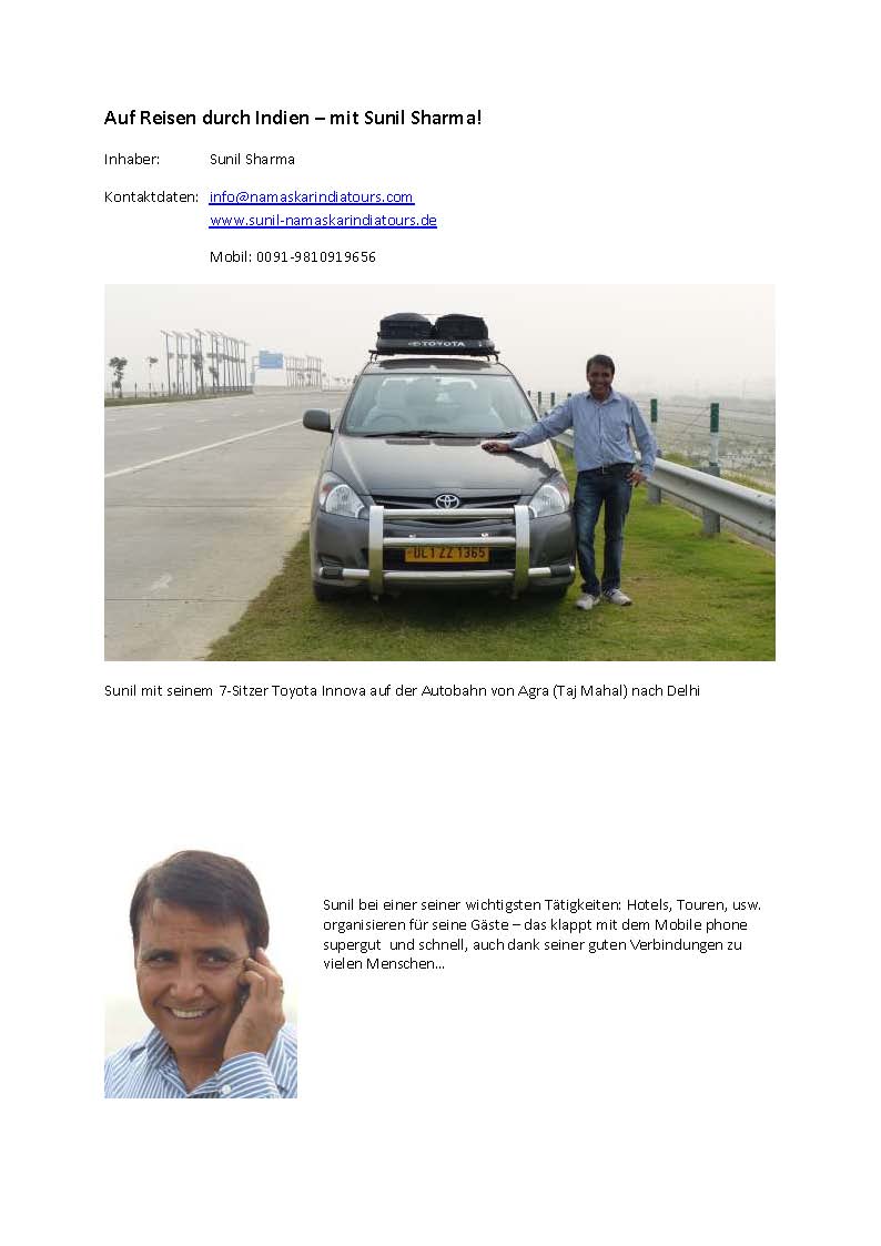 Hallo zusammen, auch wir haben einen sehr empfehlenswerten Fahrer gefunden: Im November 2012 waren wir mit Sunil Sharma in Rajasthan unterwegs. Er hat uns (5 Personen im Alter 27-71 Jahre)jederzeit sicher durch den indischen Verkehr gebracht. Darüber hinaus hat er gute Hotels ausgewählt,und hatte gute Restaurant-Empfehlungen. Die Geschichten und Diskussionen während der Fahrten haben uns Indien näher gebracht, da Sunil sehr gutes Englisch spricht. Er hatte außerdem jederzeit ein gutes Gespür dafür, wann wir auch mal unsere Ruhe haben wollten. Schon die Vorabstimmungen per Handy haben reibungslos funktioniert. Sunil bietet Touren durch ganz Indien (vorrangig im Norden)an. Er hat langjährige Erfahrungen und kann Autos für 2 oder 5-7 Personen anbieten. Sunil(at)namaskarindiatours[dot]com www.sunil-namaskarindiatours.de 0091-9810919656 Viele Grüße und Euch eine mindestens genauso schöne Reise, wie wir sie hatten! Ruth |