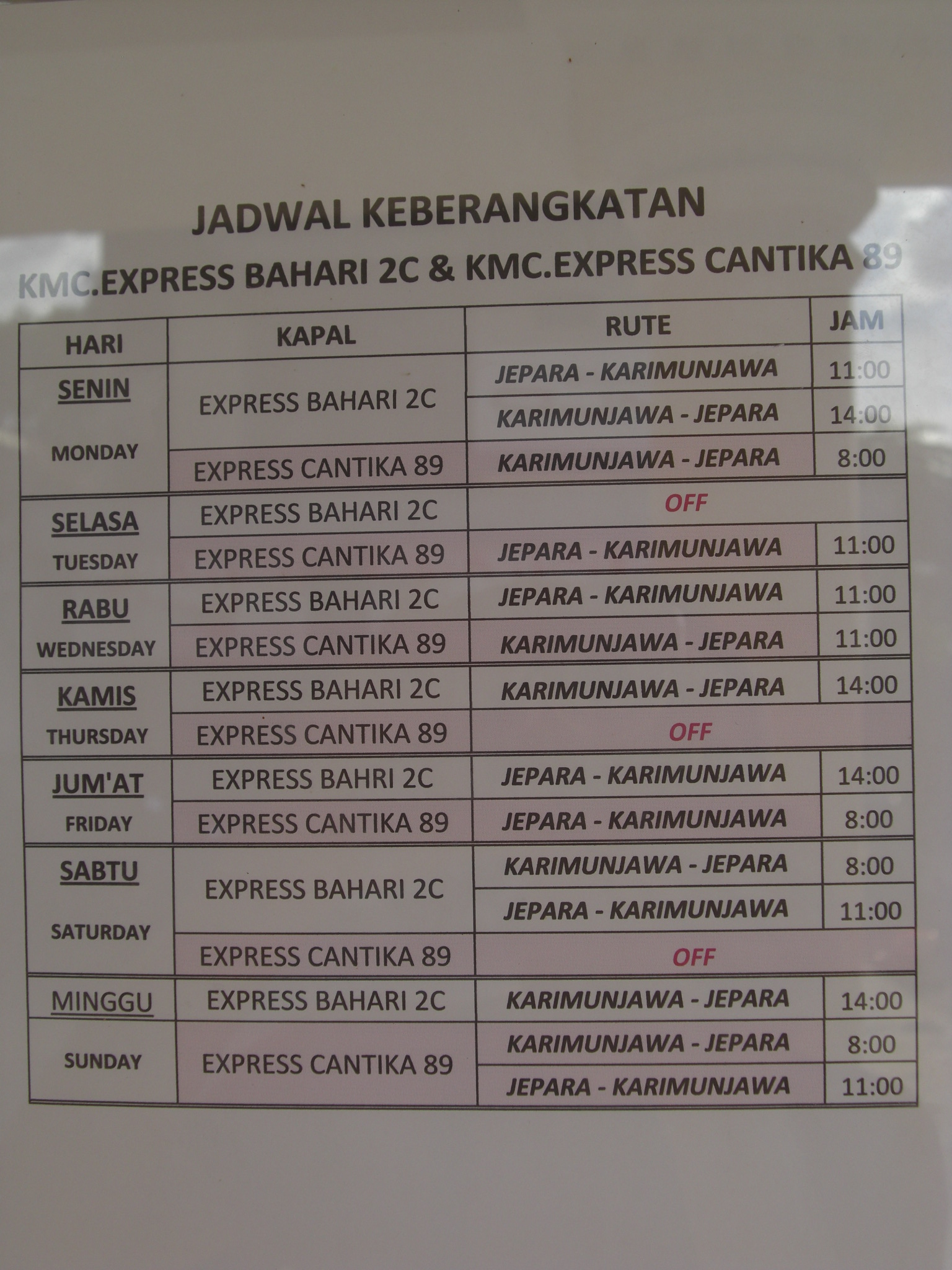 Der neue Fahrplan der 2 Speedboote von Jepara nach Karimunjawa und zurück.