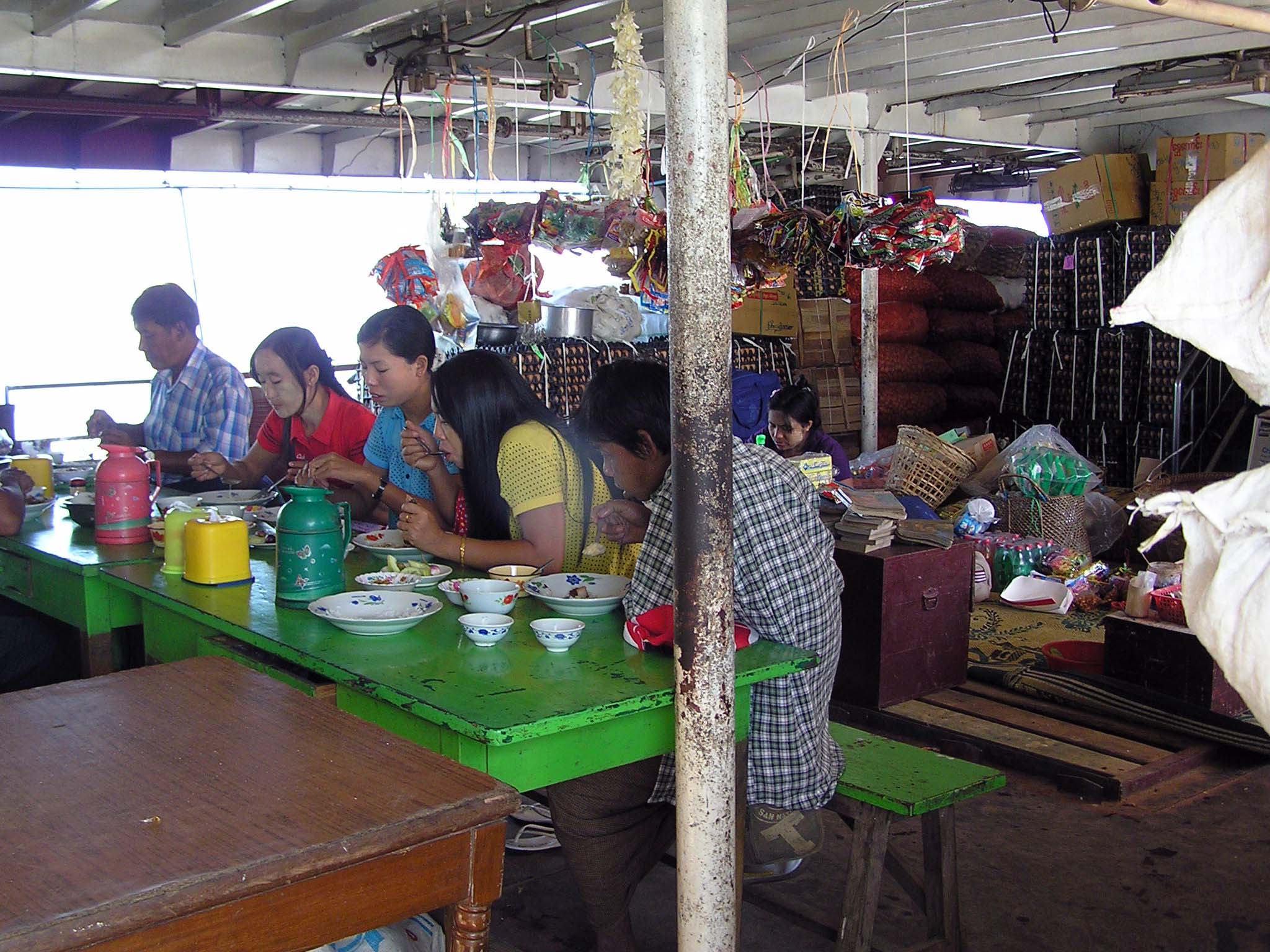 Zurück nach Mandalay mit dem "Schnellboot", Abfahrt um 8 Uhr für 26,- USD p.P ohne Kabine, dafür eine Nacht in relativ bequemen Sesseln im Unterdeck. Die meiste Zeit allerdings haben wir uns im sehr hübschen Restaurant aufgehalten.