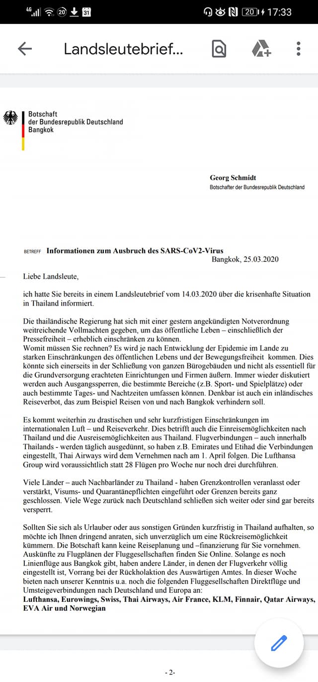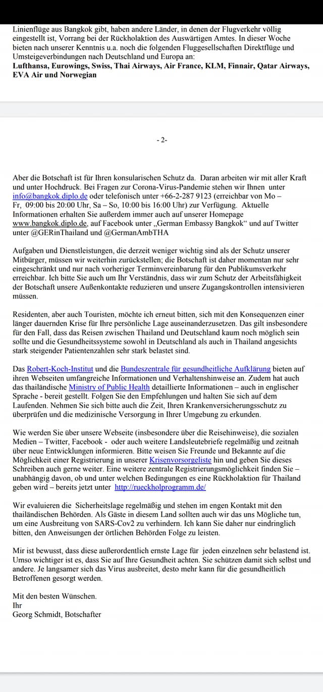 Thailand hat die Regeln verschärft, dazu gehört: Mundschutz ist Pflicht. Die deutsche Botschaft bittet alle Deutschen, die nicht bewusst auf unbestimmte Zeit in Thailand beiben wollen, nach Bangkok zu kommen. Es kann sein, dass eine Reise dorthin bald sehr schweirig bis unmöglich wird. Aus Thailand sind noch keine Rückholaktionen mit der Luftbrücke geplant, da es noch reguläre Flüge gibt. Diesen Brief der Deutschen Botschaft in Bangkok habe ich gerade im Netz gefunden. Das zweite Bild folgt gleich (ich kann hier leider nur ein Bild anhängen Take care Andrea Loose-Autorin Thailand, Vietnam, Myanmar, Kambodscha und Island, Webmasterin und Soziale Netzwerke für die Loose-Reihe.