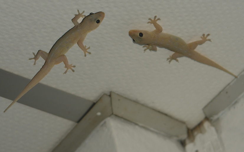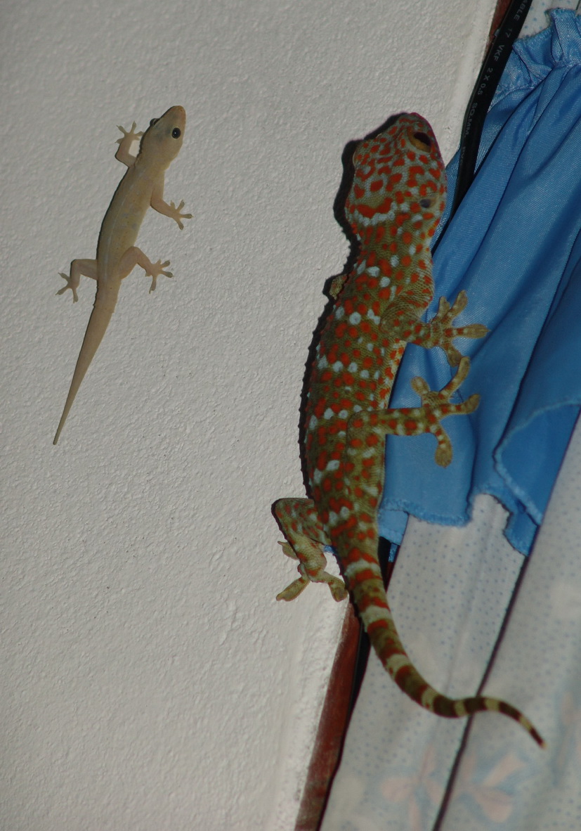 So jetzt bin ich wieder dran Die kleinen Geckos Sie laufen an der Decke und der Wand herum und fressen alles was fliegt und heissen in Wirklichkeit Dsching Dschog (eidechse). Sie werden etwa (mit Schwanz) 10 cm lang und machen nur ein sehr leises Schnalzgeraeuch! |