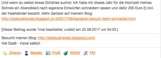 Was thewanderer schreibt, ist richtig: Die Geschäfte werden von Indern betrieben, die dir die Sachen verkaufen und Maß nehmen. Die eigentlichen Schneider sind Thais, und die produzieren für mehrere dieser Aushänge-Geschäfte. Anders als thewanderer denke ich aber, dass es sich lohnt, in Thailand Hemden oder Anzüge oder Kostüme schneidern zu lassen. Als ich noch Business-Outfits brauchte, habe ich die alle in Thailand maßschneidern lassen für ein Bruchteil dessen, was ich in DE bezahlt hätte. Es lohnt sich natürlich nur dann, wenn du dich für einen qualitativ wirklich hochwertigen Stoff entscheidest (ägyptische Baumwolle z.B.), Billigware gibt es von der Stange wohl auch zum gleichen Preis. Leider kenne ich mich eher in der Sukhumvit-Gegend aus (Kao San kannst du sowieso vergessen, da gehe ich seit Jahren nicht mehr hin), aber i.d.R. kommen Schneider (also die Inder) auch zu dir ins Hotel. Wenn du eine Empfehlung möchtest, schick mir doch bitte eine PM, ich möchte das hier nicht öffentlich machen. Und wenn du selbst etwas Schönes suchst: Ich habe mir dieses Jahr für die Hochzeit meines Sohnes ein Abendkleid nach eigenene Entwürfen schneidern lassen und dafür 200 Euro (!) incl. der Haarbänder bezahlt. Mehr darüber auf meinem Blog: http://dokbuatravels.blogspot.co.id/2017/06/bangkok-besuch-beim-schneider.html [Dieser Beitrag wurde 1mal bearbeitet, zuletzt am 22.09.2017 um 04:03.] Besucht meinen Blog: http://dokbuatravels.blogspot.com/
