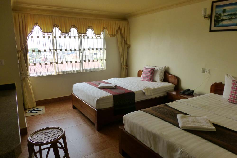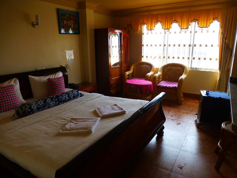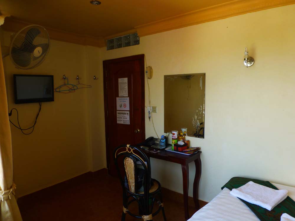 Schmales hohes Eckgebäude, 5 Etagen mit Fahrstuhl. Die Zimmer sind im Stil eines Mittelklassehotels gut möbliert, TV und Minibar. Hell geflieste Bäder mit Warmwasser. Es gibt wahlweise Ventilator oder AC.