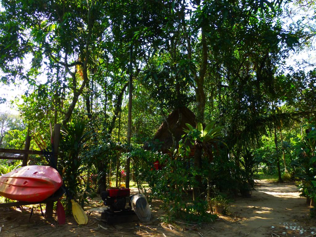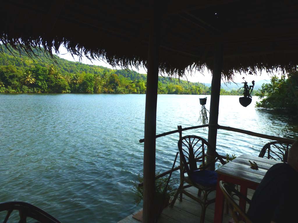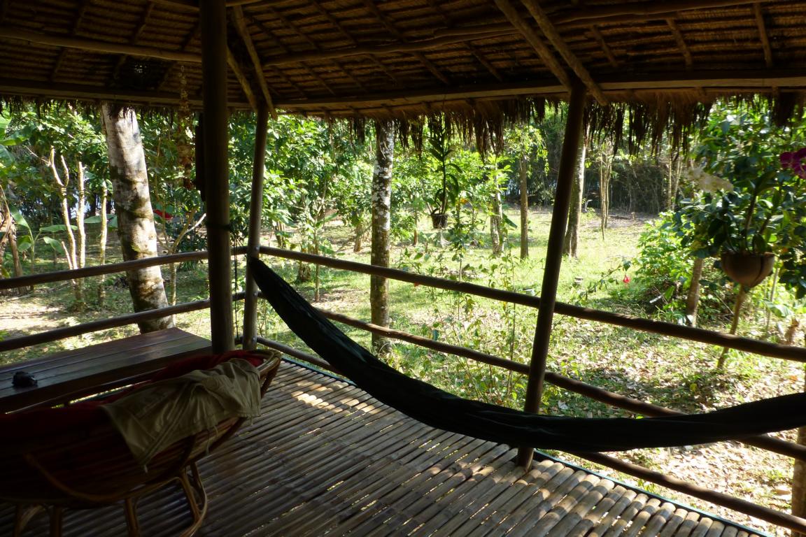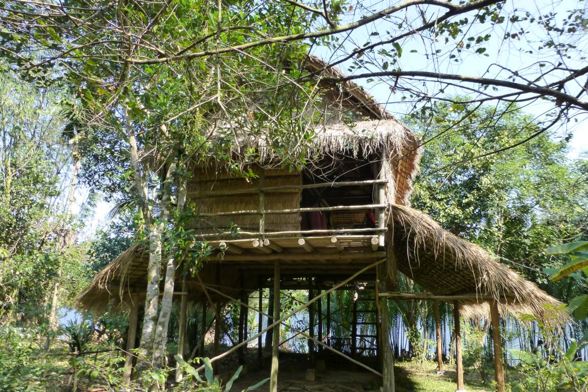Thomas und seine Frau Sothea vermieten auf ihrem weitläufigen Grundstück drei einfache Matten-Bungalows: großzügig mit einer Matratze auf dem Boden, alle mit Terrasse, Hängematte und nebendran ein eigenes Bad. Wer mag und Geld sparen will, kann auch in einer Hängematte nächtigen. Wirklich toll ist die Lage am Fluss. Die Kajaks werden kostenlos zur Erkundung ausgeliehen. Auf der Gemeinschaftterrasse am Fluss wird Frühstück serviert, abends kann gemeinsam gegessen werden. Zwischen US$10 und US$40 inkl. Frühstück.