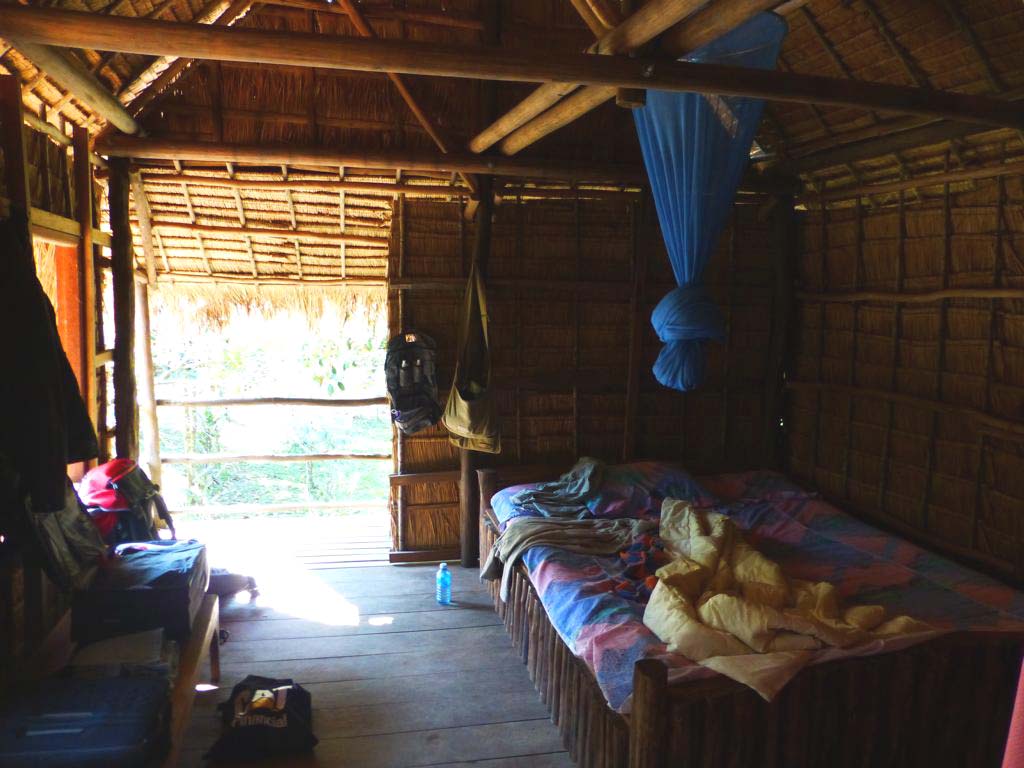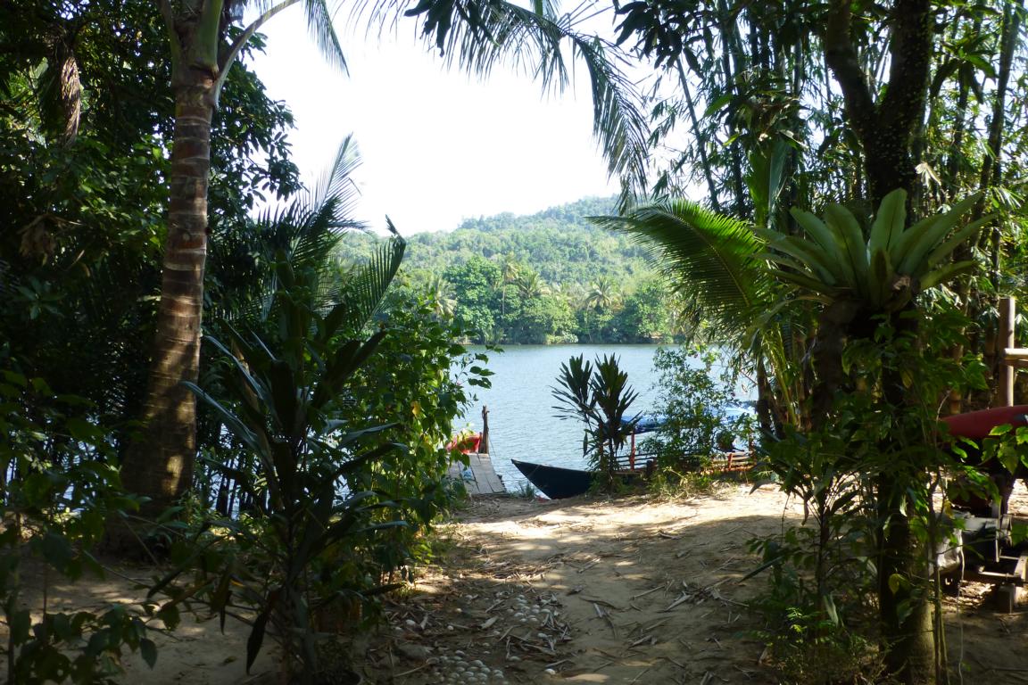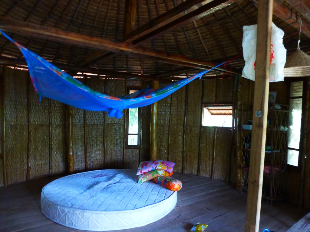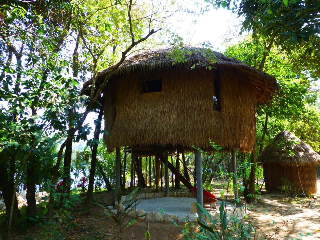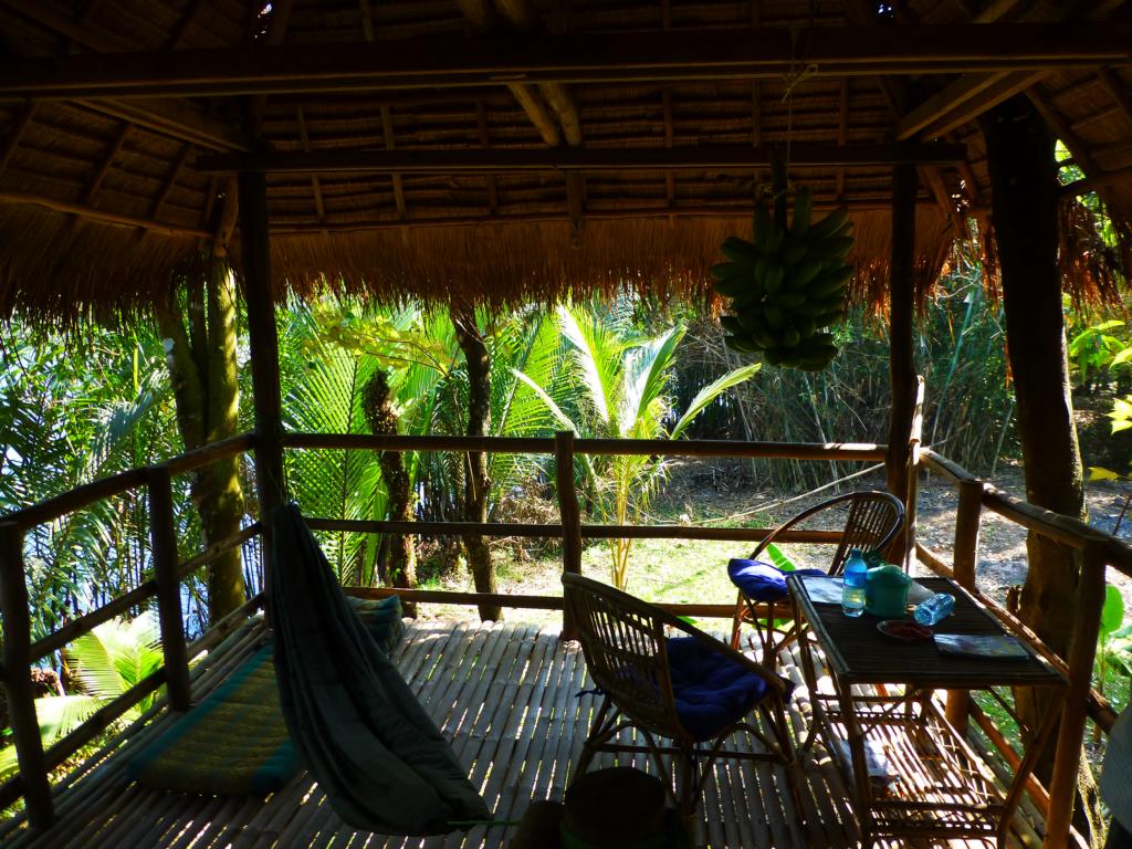 Thomas und seine Frau Sothea vermieten auf ihrem weitläufigen Grundstück drei einfache Matten-Bungalows: großzügig mit einer Matratze auf dem Boden, alle mit Terrasse, Hängematte und nebendran ein eigenes Bad. Wer mag und Geld sparen will, kann auch in einer Hängematte nächtigen. Wirklich toll ist die Lage am Fluss. Die Kajaks werden kostenlos zur Erkundung ausgeliehen. Auf der Gemeinschaftterrasse am Fluss wird Frühstück serviert, abends kann gemeinsam gegessen werden. Zwischen US$10 und US$40 inkl. Frühstück.