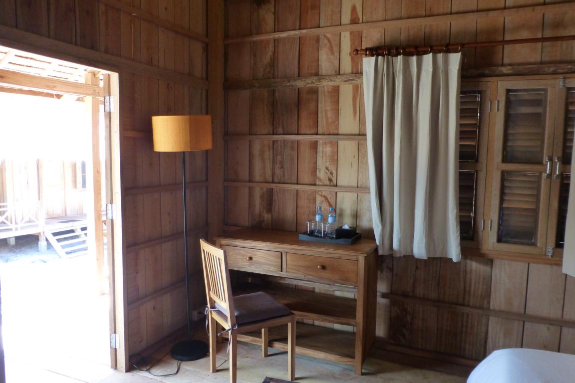 Große Luxus-Anlage am Sok San-Strand: 28 Bungalows in 9 Reihen parallel zum Strand. Innen sind alle Holz-Bungalows komfortabel eingerichtet: Bett, Schrank, Schreibtisch und ein schickes Bad. 24 Std. Strom, bis auf die letzte Reihe alle Zimmer mit AC.