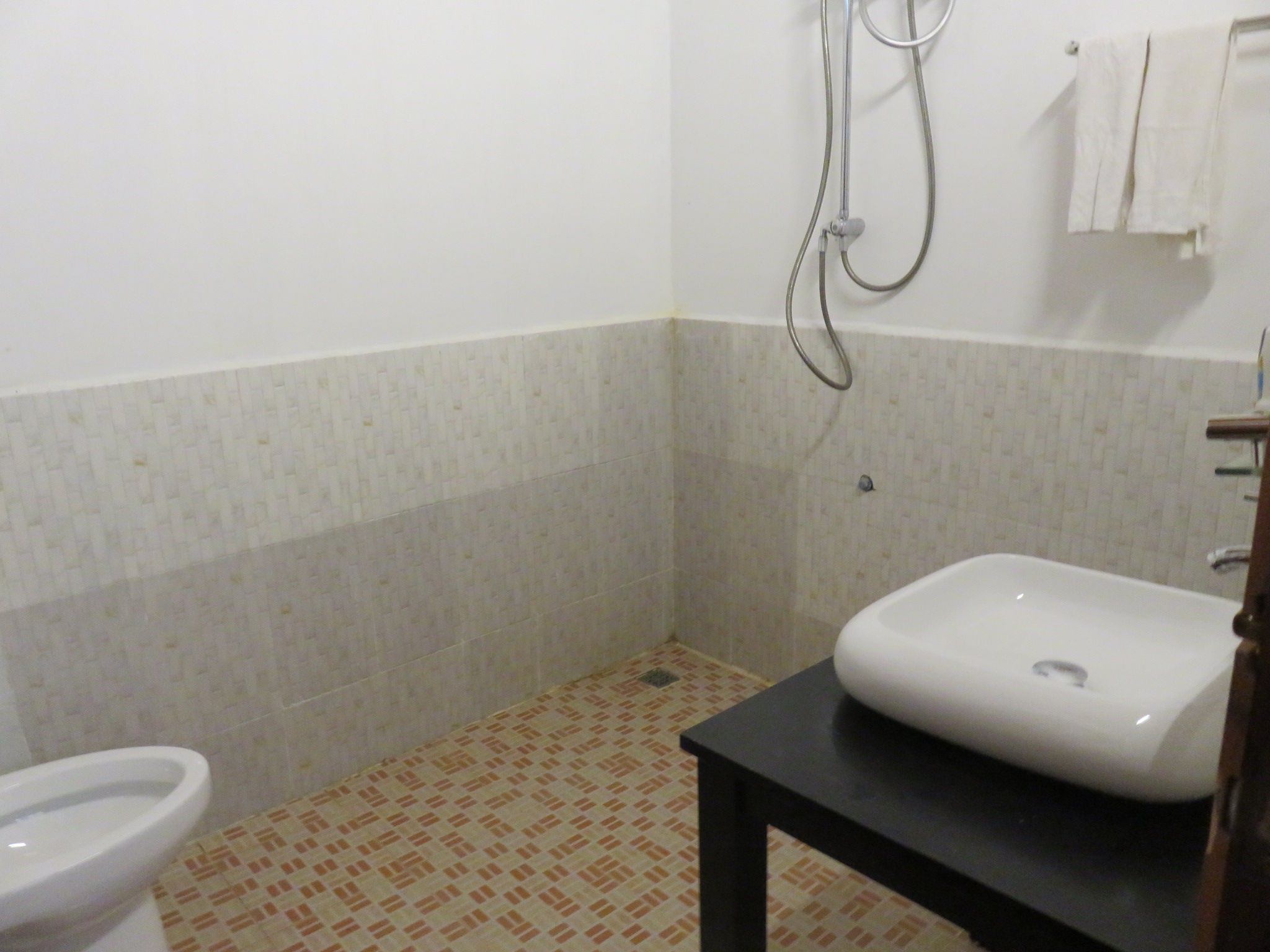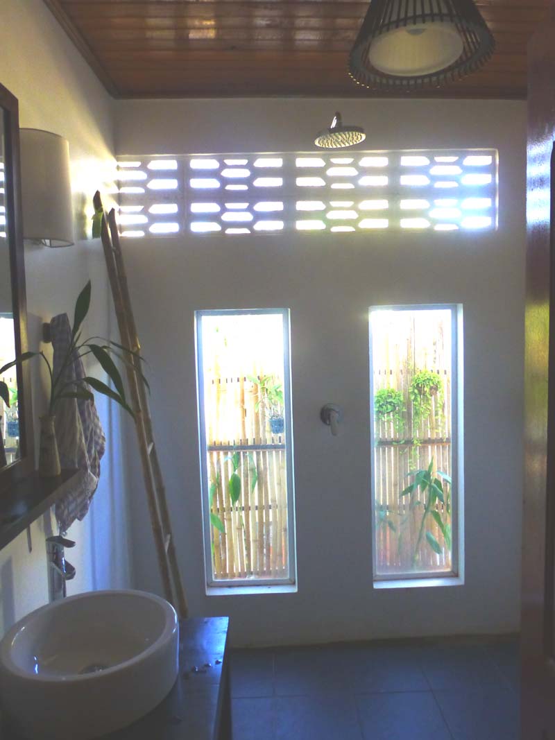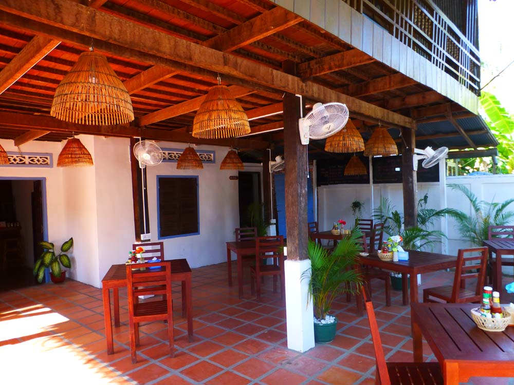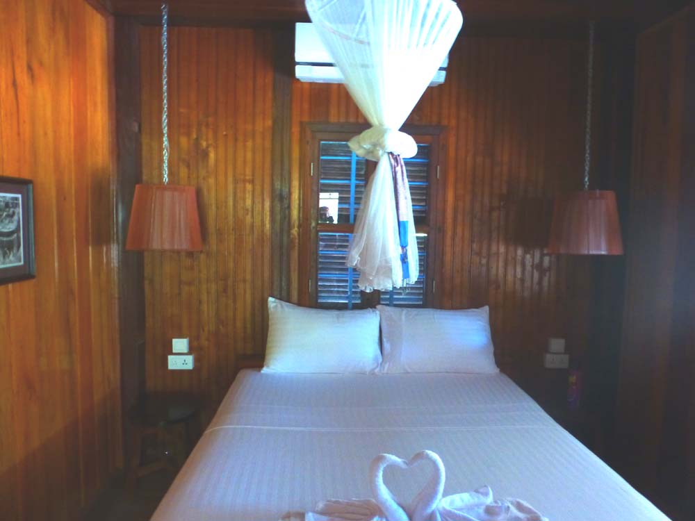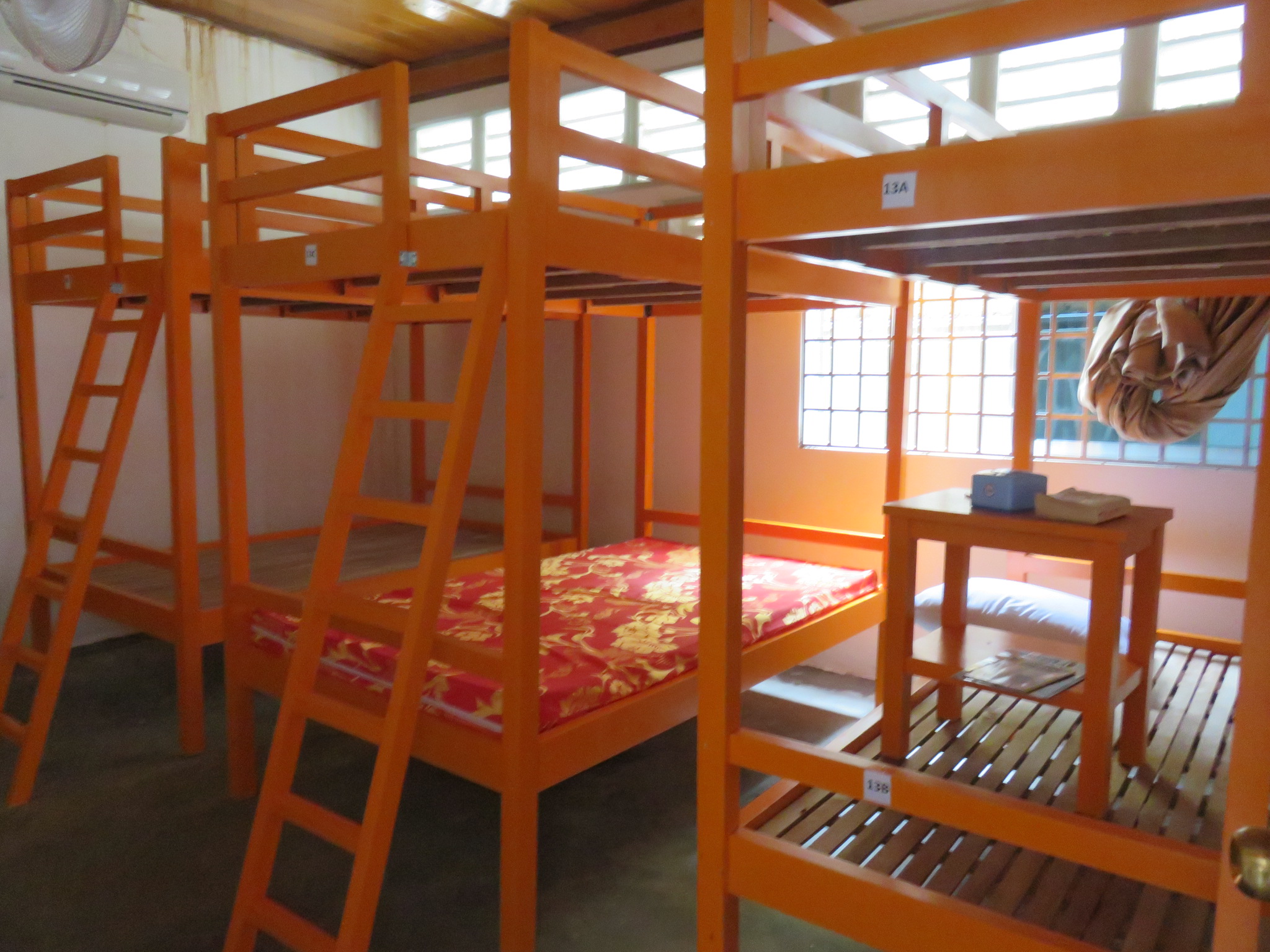 Ebenerdig liegen die neueren, gemauerten Zimmer mit eigenem Bad und AC. Außerdem gibt es ein Zimmer mit Dormbetten (Stockbetten).
