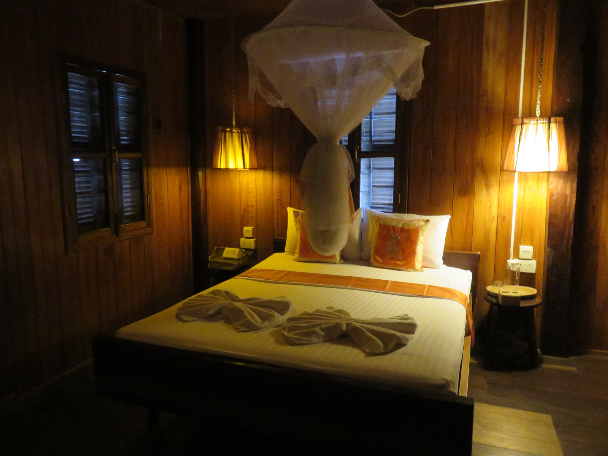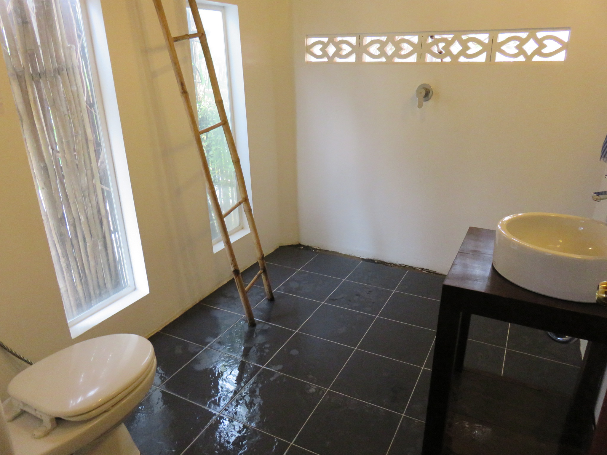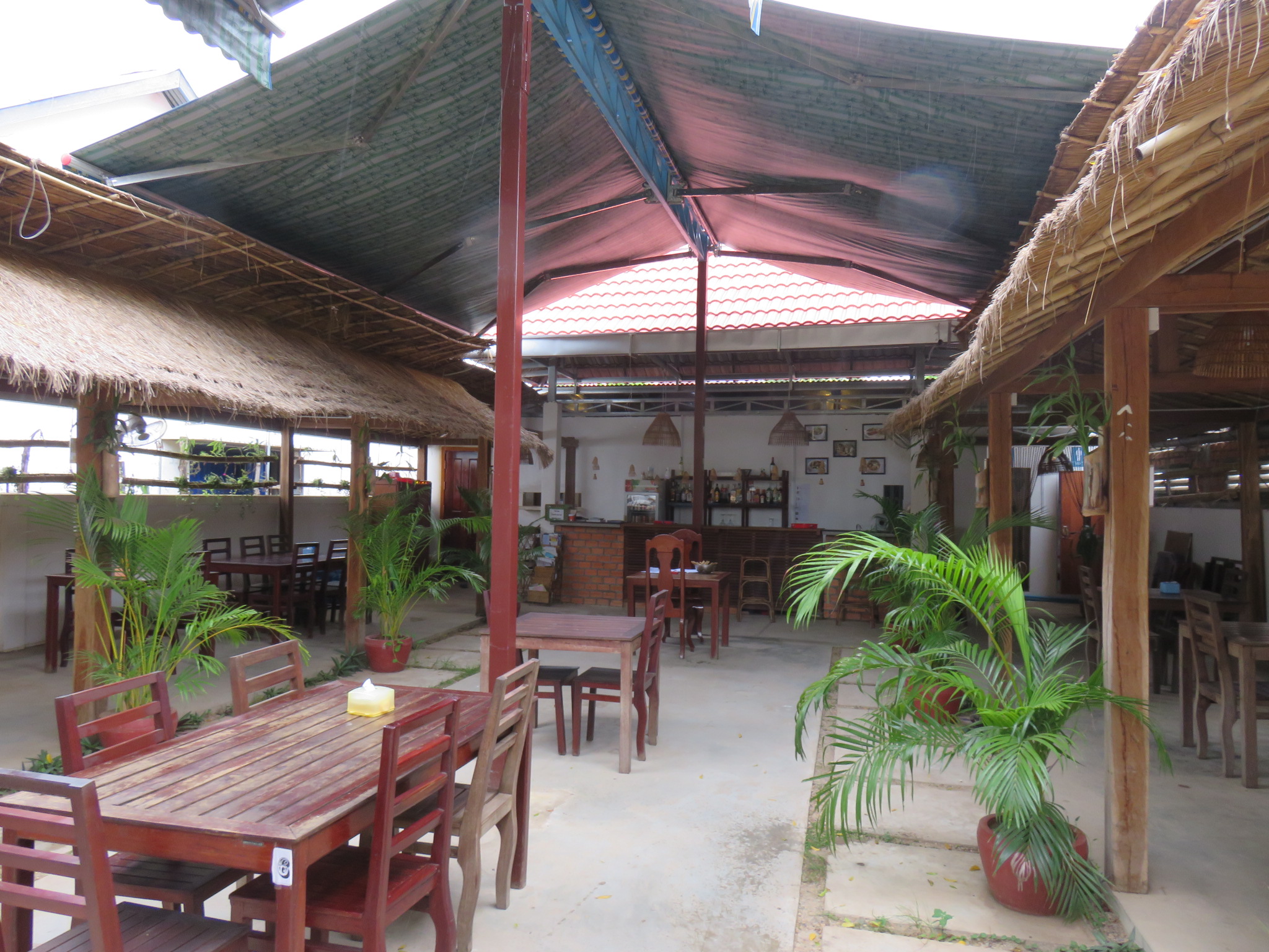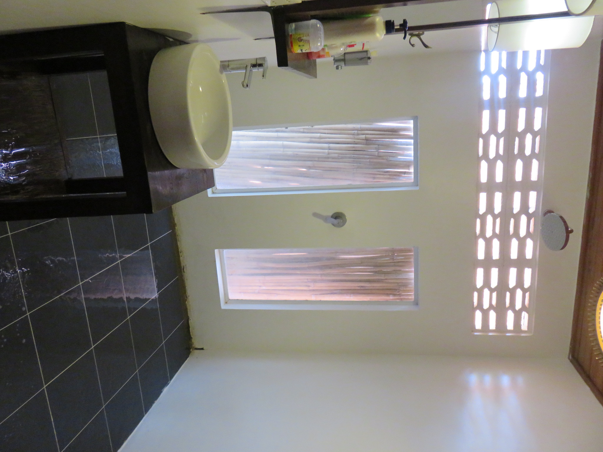 Ebenerdig liegen die neueren, gemauerten Zimmer mit eigenem Bad und AC. Außerdem gibt es ein Zimmer mit Dormbetten (Stockbetten).