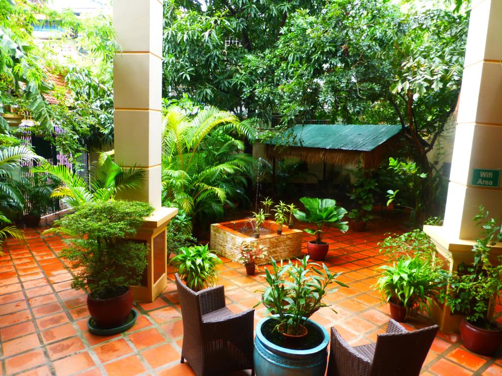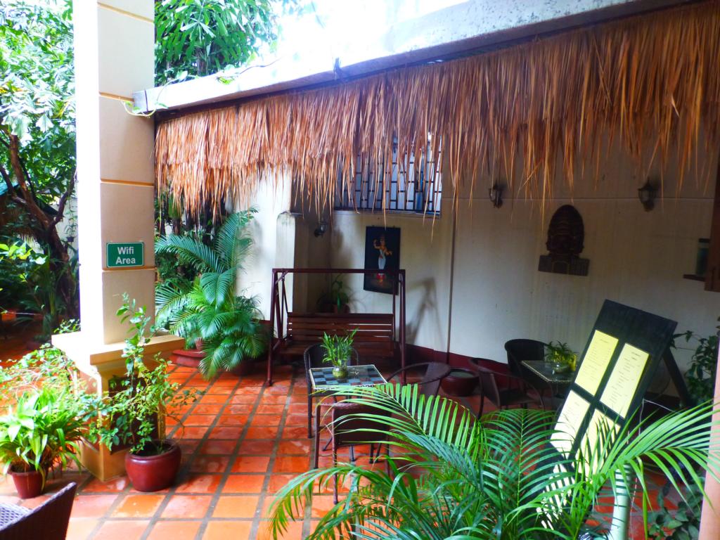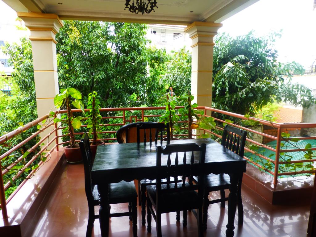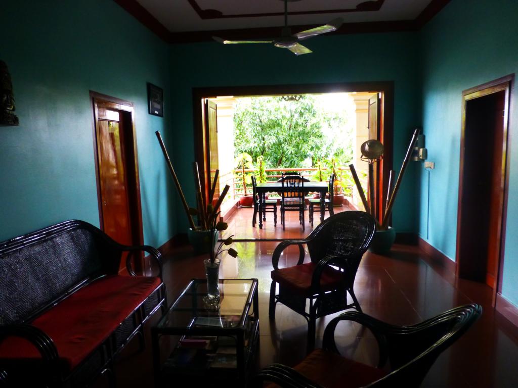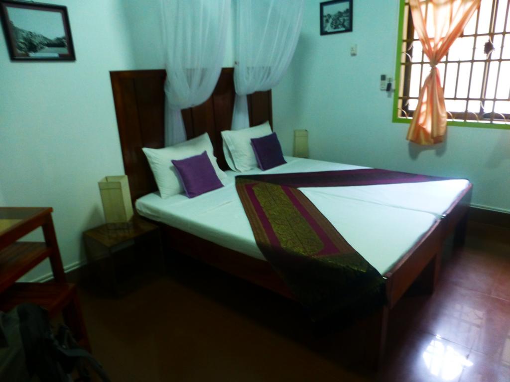 In einer kleinen Seitenstraße befindet sich das Guesthouse: Vor dem Haus ist der wunderbar begrünte Innenhof, von einer hohen Mauer abgeschirmt. Hier kann man prima relaxen oder etwas essen. Die Zimmer im Khmer-Haus sind ordentlich eingerichtet (vielleicht ein wenig altbacken), aber penibel sauber. Schrank, Kühlschrank, Tisch und Stuhl gehören zur Ausstattung. Das Dach ist ausgebaut, die kleineren Zimmer dort sind über eine schmale Treppe zu ersteigen. Zwischen US$20-30 inkl. Frühstück.
