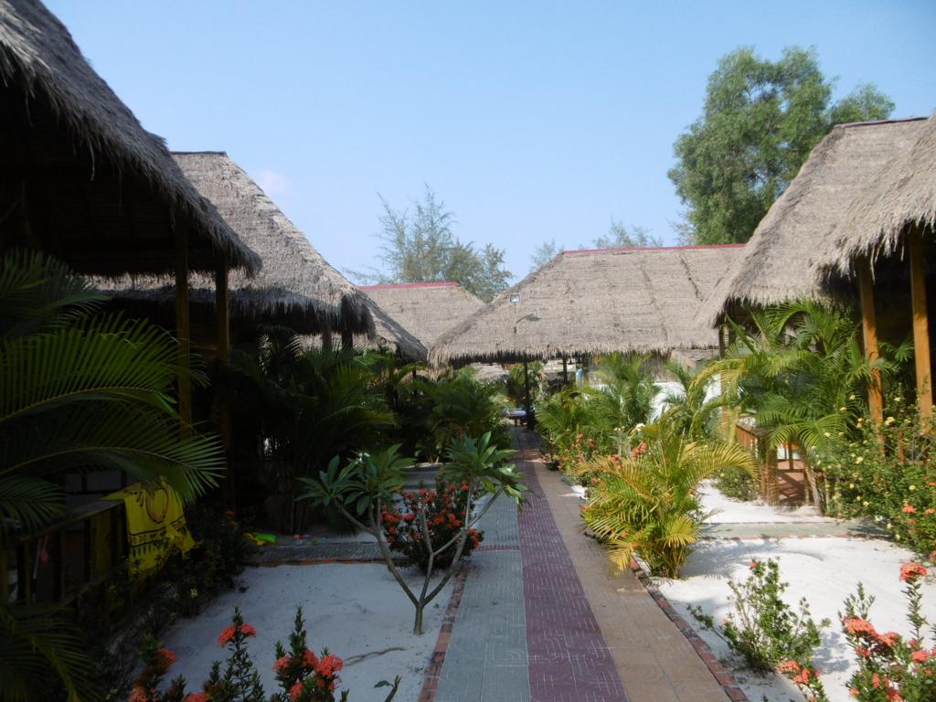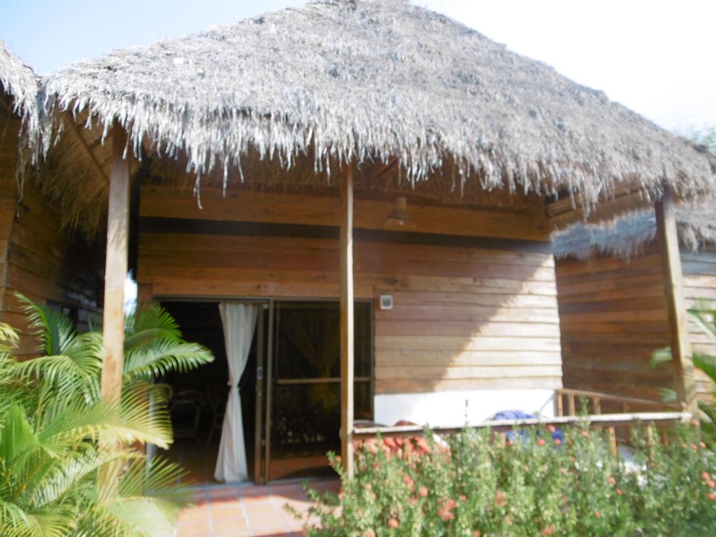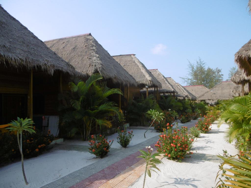 Zwei Reihen großer Holzbungalows. Innen mit einem Bett und Moskitonetz sowie einer Rattanablage möbliert. Wahlweise gibt es Ventialtor oder AC.