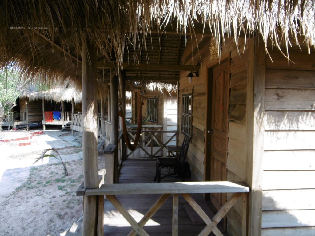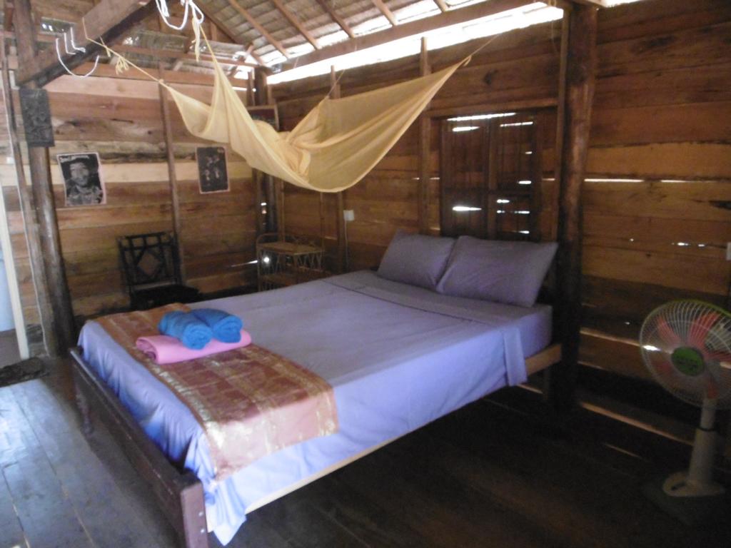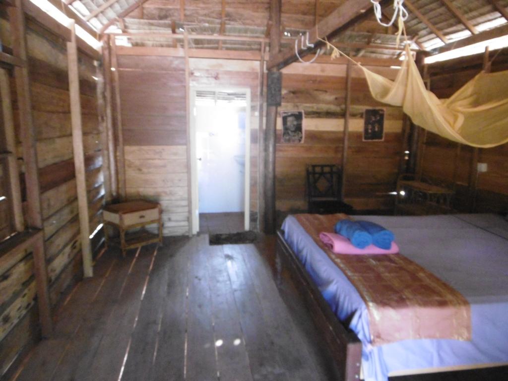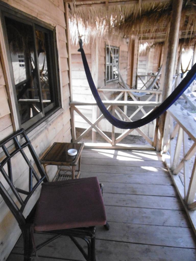 Die einfachen Holzb-Matten-Bungalows sind wirklich geräumig. Möbliert mit Bett, Moskitonetz, Ablagefläche, Hängematte auf der Terrasse. Und ein paar Rockstar-Poster an den Wänden