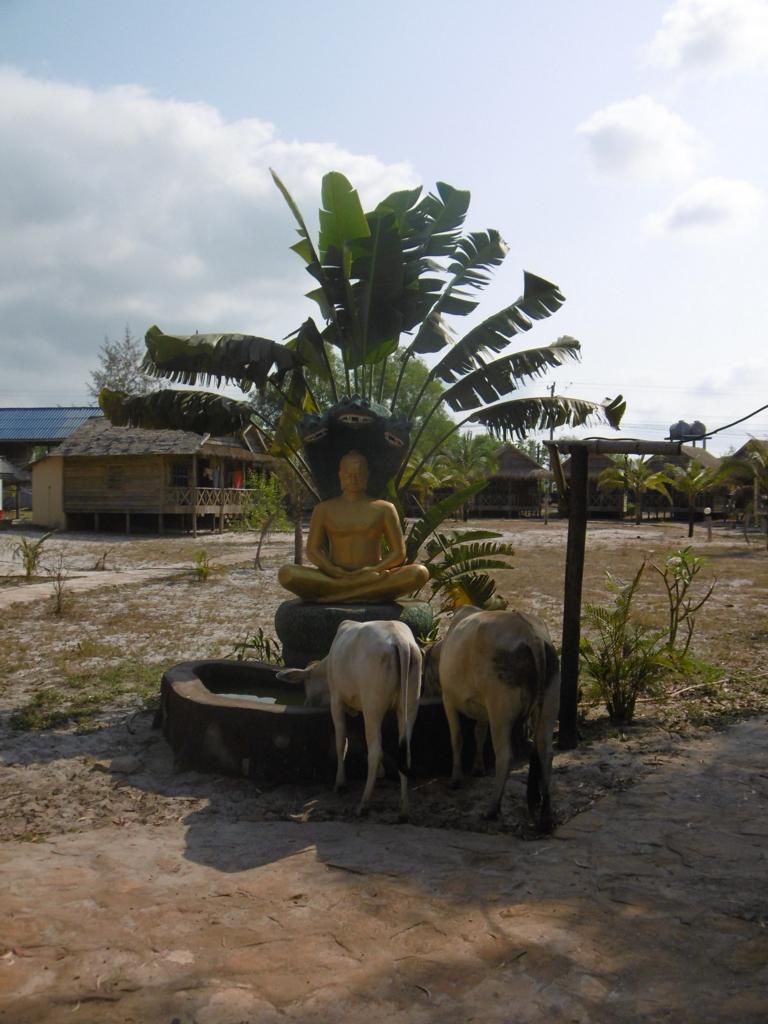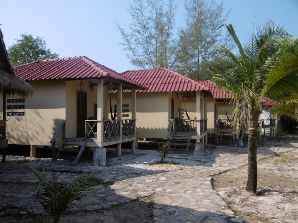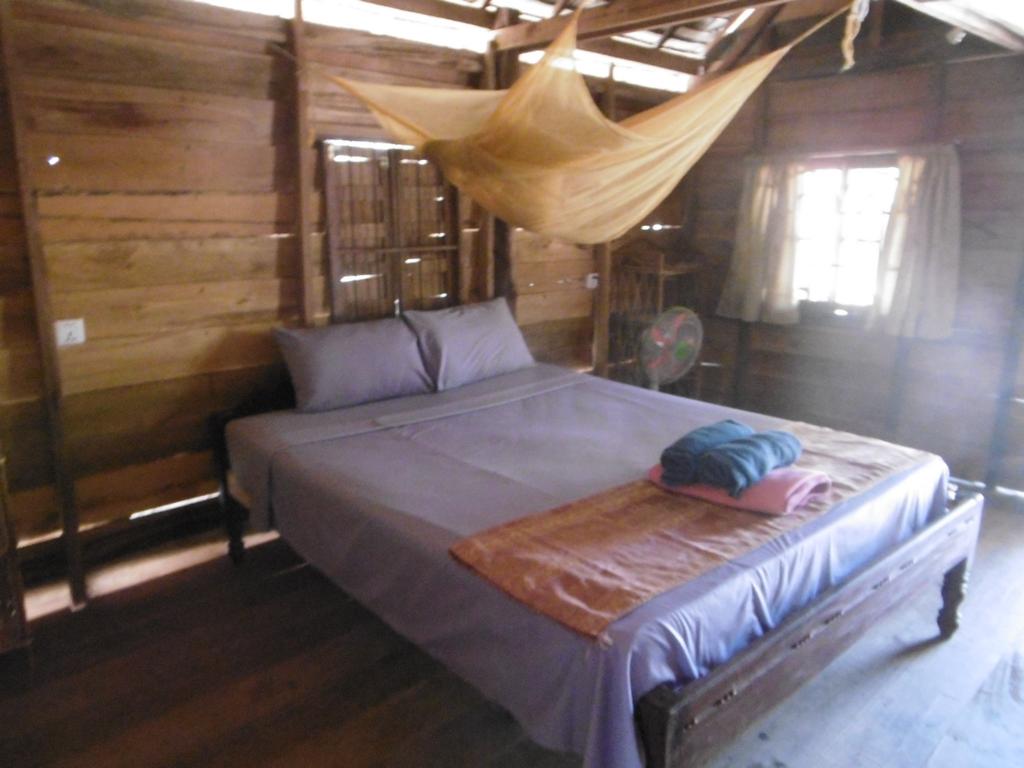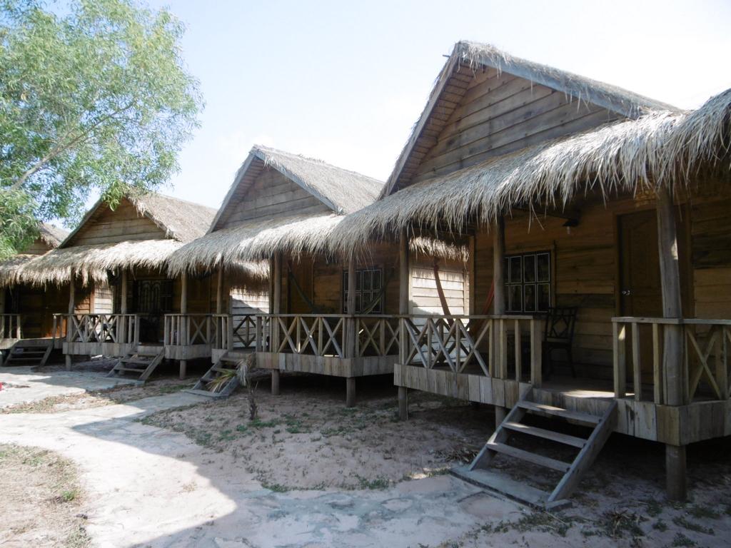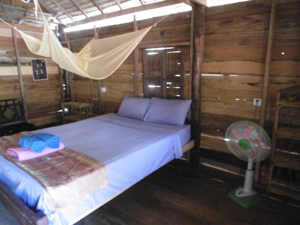 Die einfachen Holzb-Matten-Bungalows sind wirklich geräumig. Möbliert mit Bett, Moskitonetz, Ablagefläche, Hängematte auf der Terrasse. Und ein paar Rockstar-Poster an den Wänden