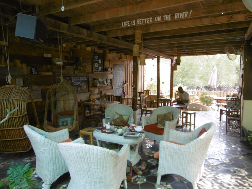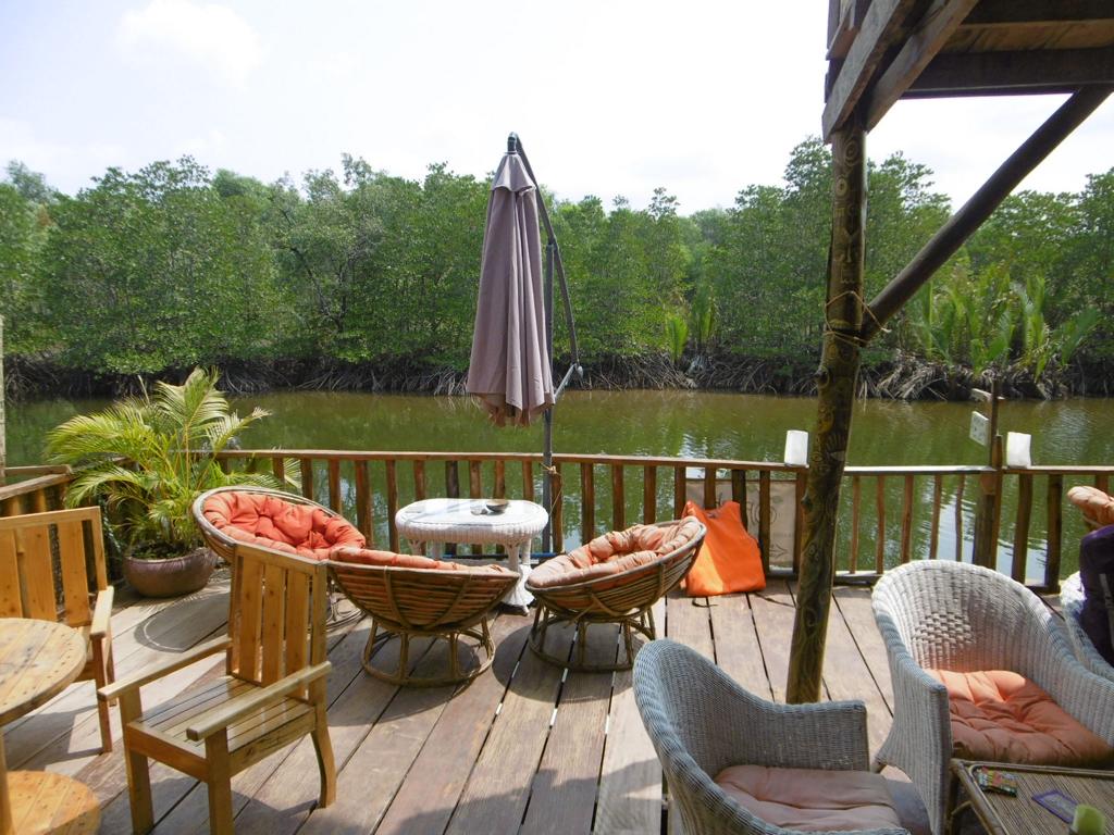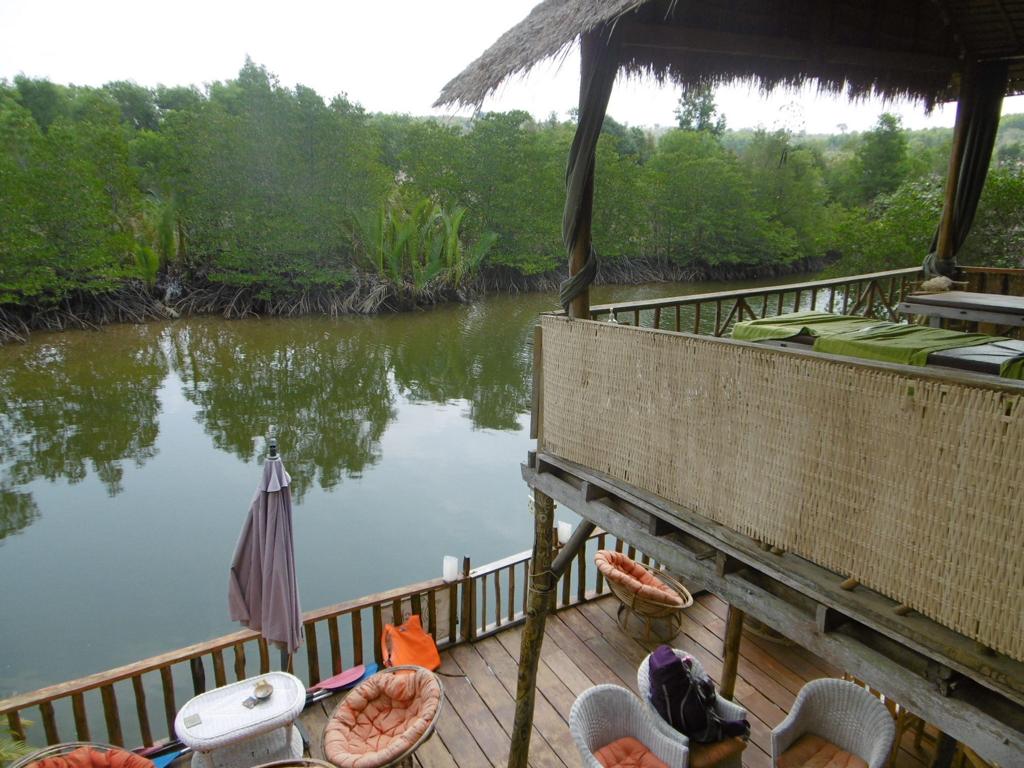 Diese Anlage lohnt auf jeden Fall einen Besuch. Das Restaurant (nur Tageskarte mit vielen veganen und vegetarischen Gerichten) ist nicht nur urgemütlich eingerichtet, toll ist die Terrasse über dem Fluss mit Blick auf Mangroven. Im Obergeschoss ist der Blick fast noch besser, hier werden Yoga und Massage angeboten.