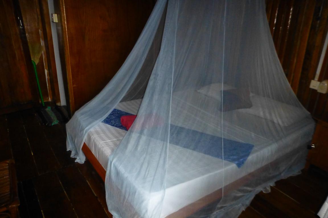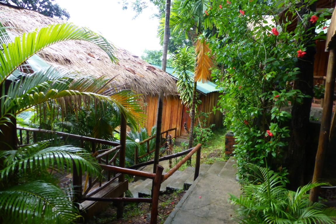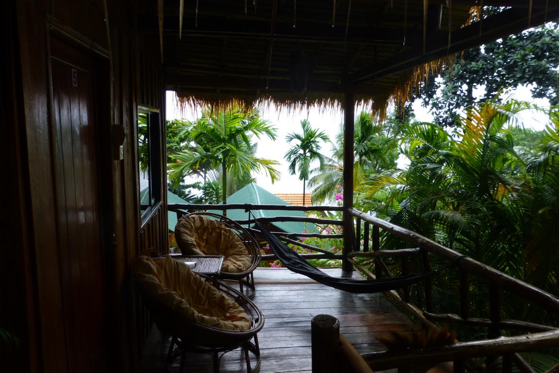 Viele Holzbungalows im Hang, einige davon mit schönem Blick ins Grün und bis zum Meer. Drinnen gibt es nicht viel mehr Ausstattung als ein Bett und Moskitonetz. Weiter oberhalb stehen Steinbungalows mit AC. Tolle neue Bäder.