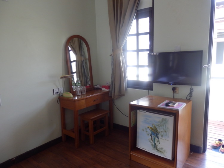 Die Zimmer in den Doppelbungalows sind relativ groß, gut ausgestattet, jedoch nicht gerade schick. Mit knapp US$60 auch realtiv teuer für das Gebotene.