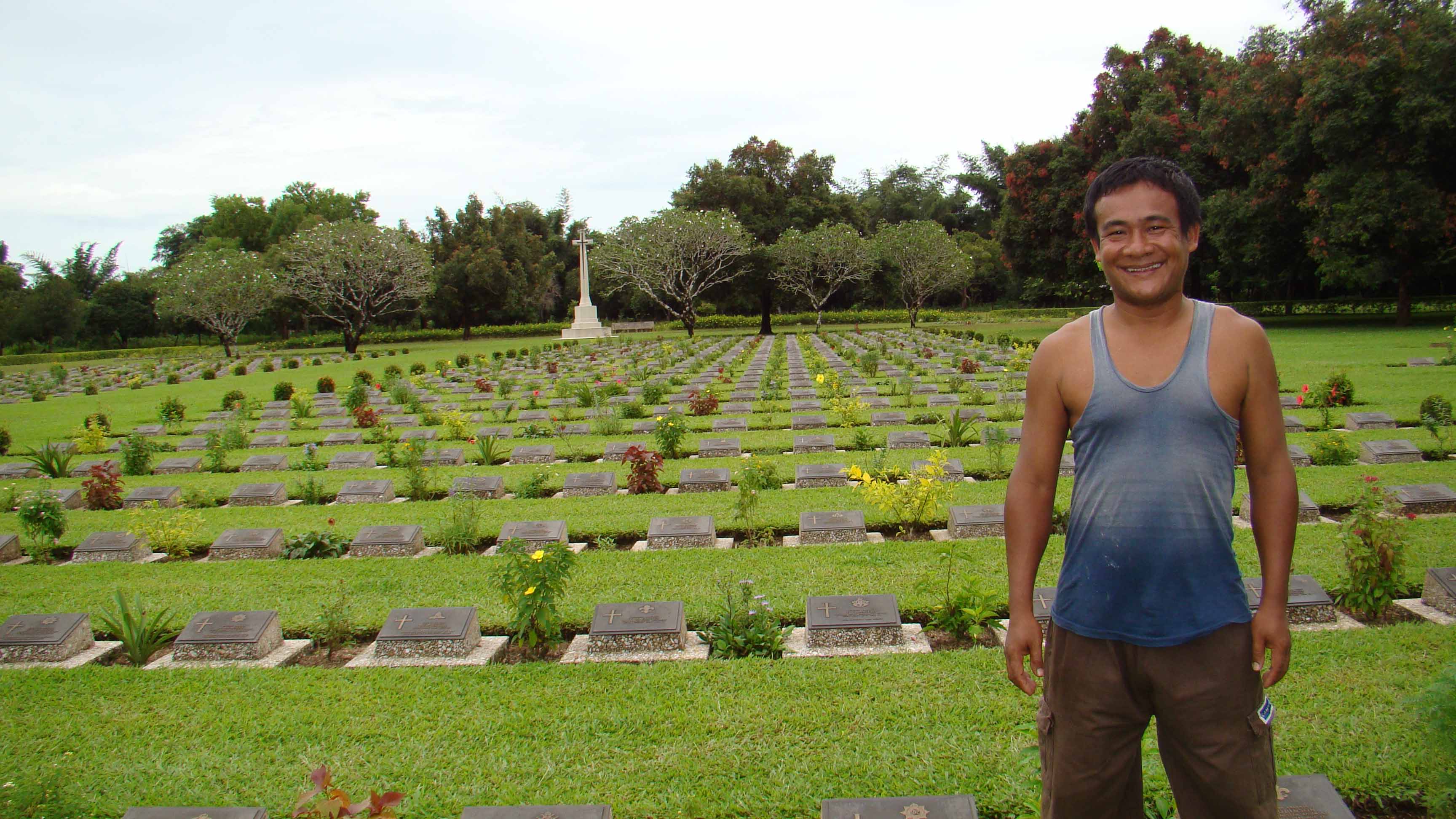 Einst im Management des Hotels „Trader`s“ in Yangon beschäftigt und gut Englisch sprechend, freut er sich stets über Besucher des „Thanbyuzayat War Cemetary“ – und weiß so manche Anekdote zu erzählen. Wie zum Beispiel die des britischen Soldaten H. Roston, der mit 24 Jahren sein Leben lassen musste. Frisch verheiratet ist sei damals gewesen und noch heute würde seine Frau jedes Jahr pünktlich zum Hochzeitstag – in 2010 war es bereits der 70. – eine Nachricht schicken, die er mit ein paar Blumen auf den Grabstein ihres gefallenen Ehemannes zu legen habe... Doch auch viele Inschriften sind dazu geeignet, die Besucher mit kurzen, aber herzergreifenden Worten und Sätzen zu Tränen zu rühren.