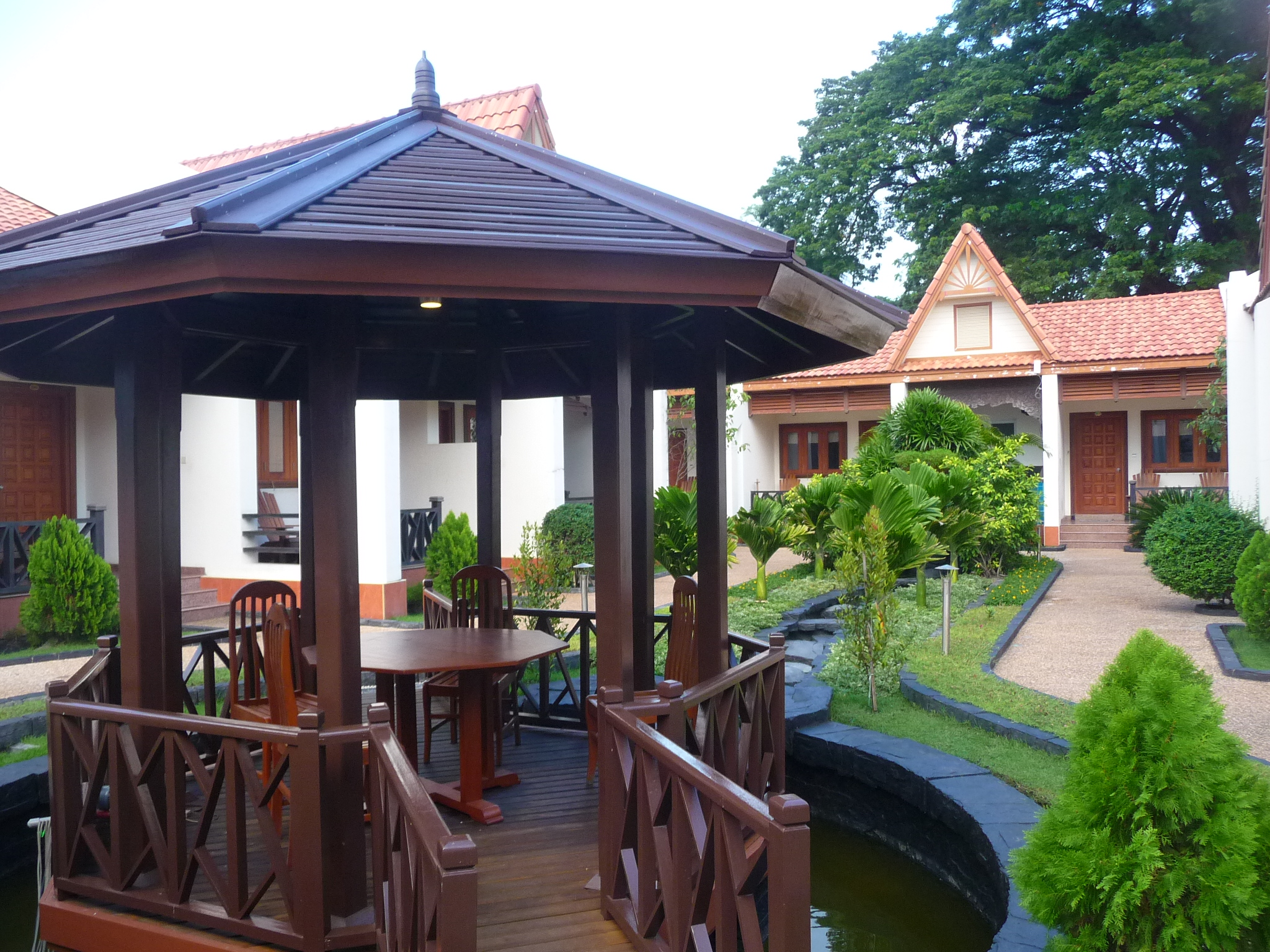 Schönes Hotel am Fluss. Die Zimmer sind im Bungalow Stil erbaut und liegen rund um einen kleinen Garten mit Wasserbecken und Pavillons.