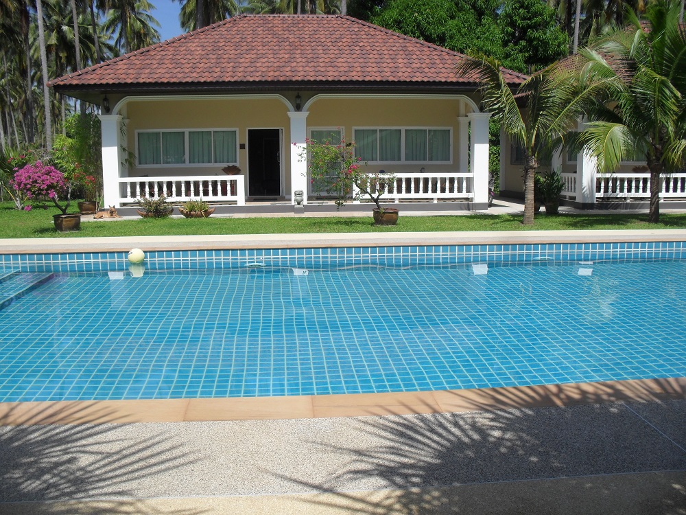 4 große und komfortable Steinbungalows rund um einen Pool.
