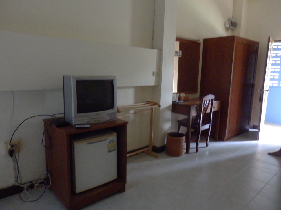 Die Zimmer sind mit allem Nötigen wie Bett, Tisch und Stühle, Schrank, Kühlschrank und TV eingerichtet und ansprechend groß.