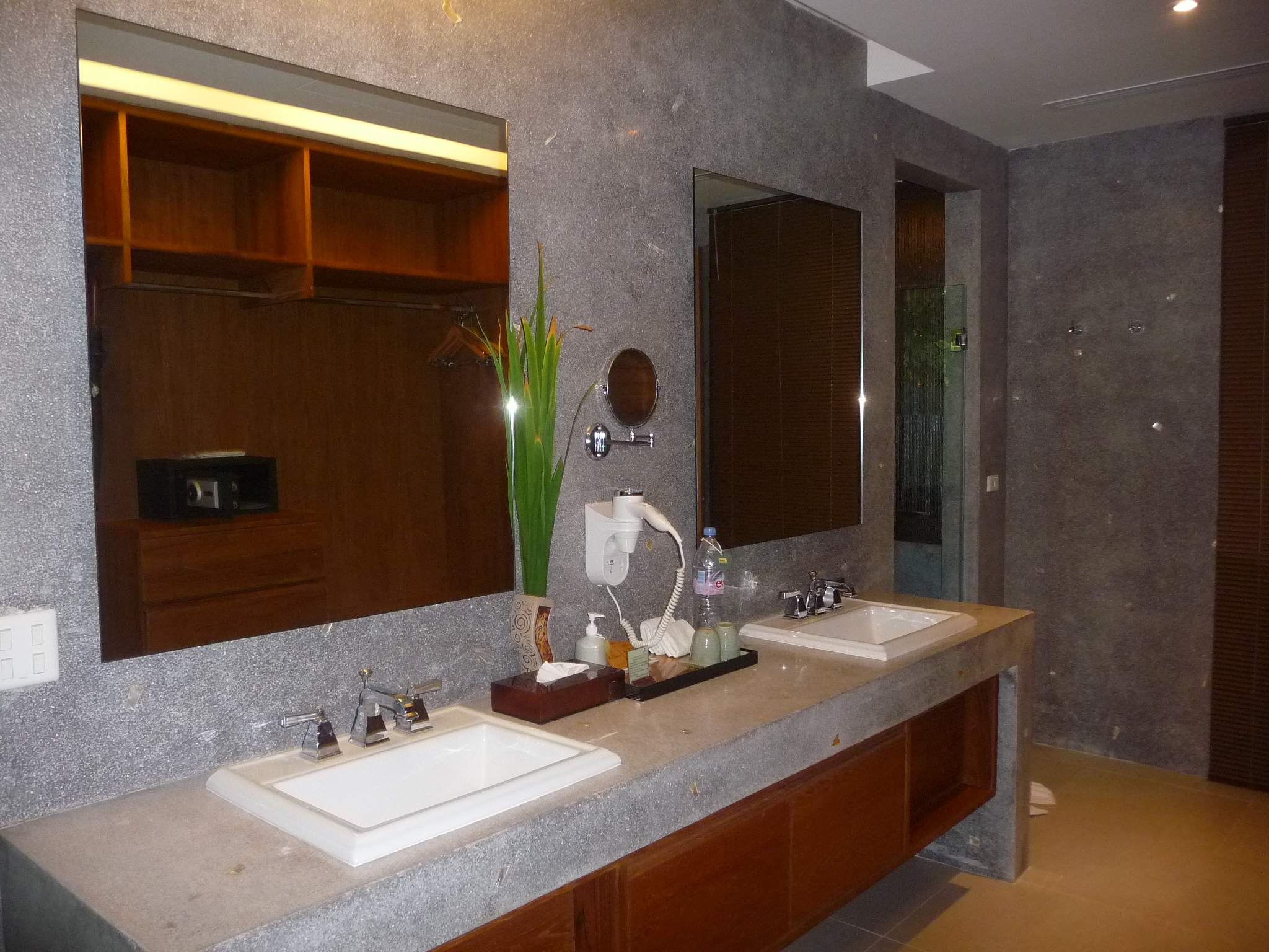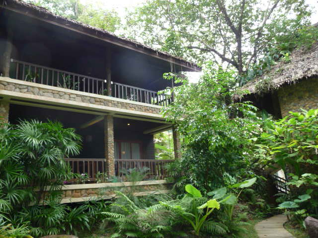 Sehr geschmackvolle, von außen in dunkelbraunem Holz verkleidete Bungalows in tropischer Gartenanlage.