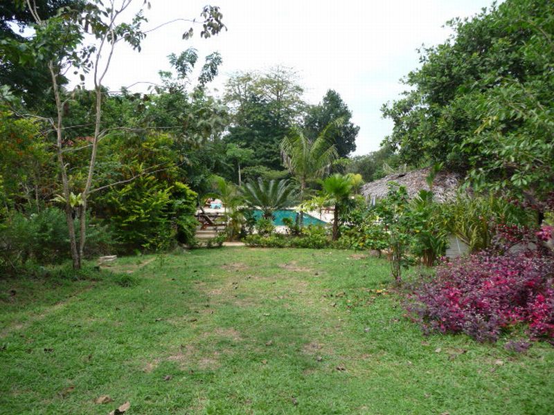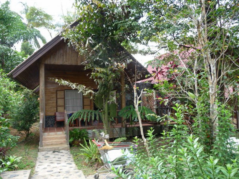 Bungalows mit AC und Ventilator aus Holz rund um einen kleinen Pool in gepflegter Gartenanlage.