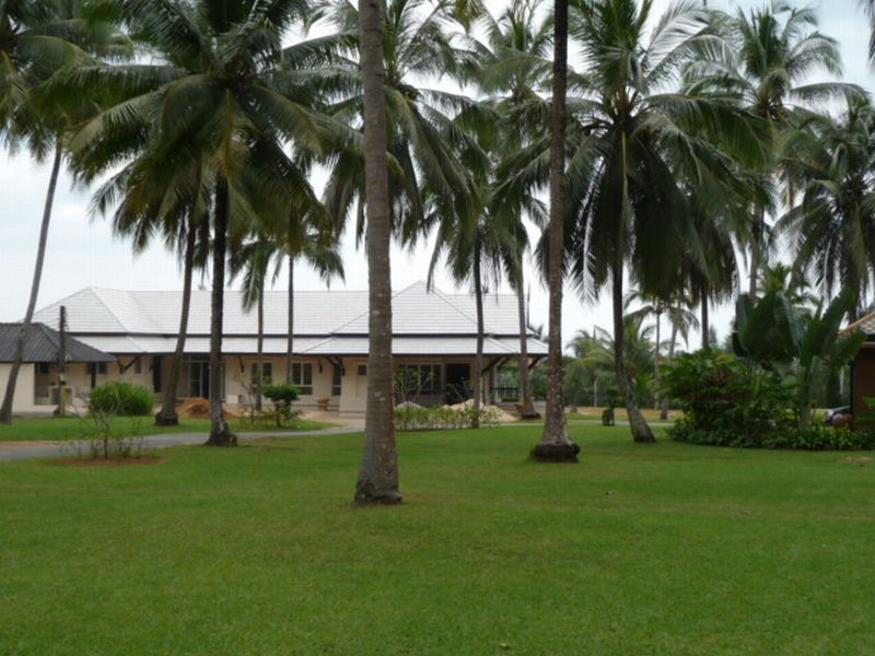 Riesige Anlage mit Golfplatz-Rasen und vielen hohen parallel stehenden Palmen.