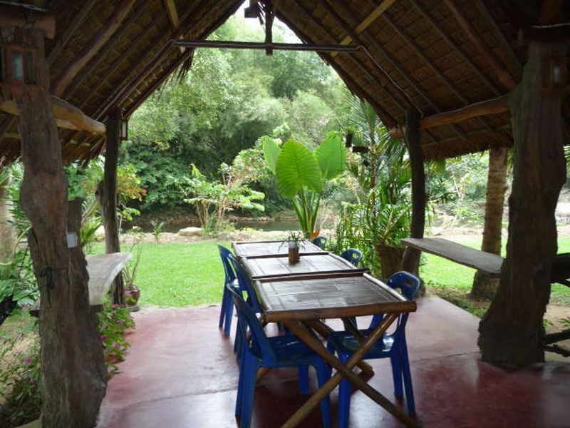40 Bungalows auf Stelzen aus Holz, Stein und Matte stehen im Garten und am Fluss.