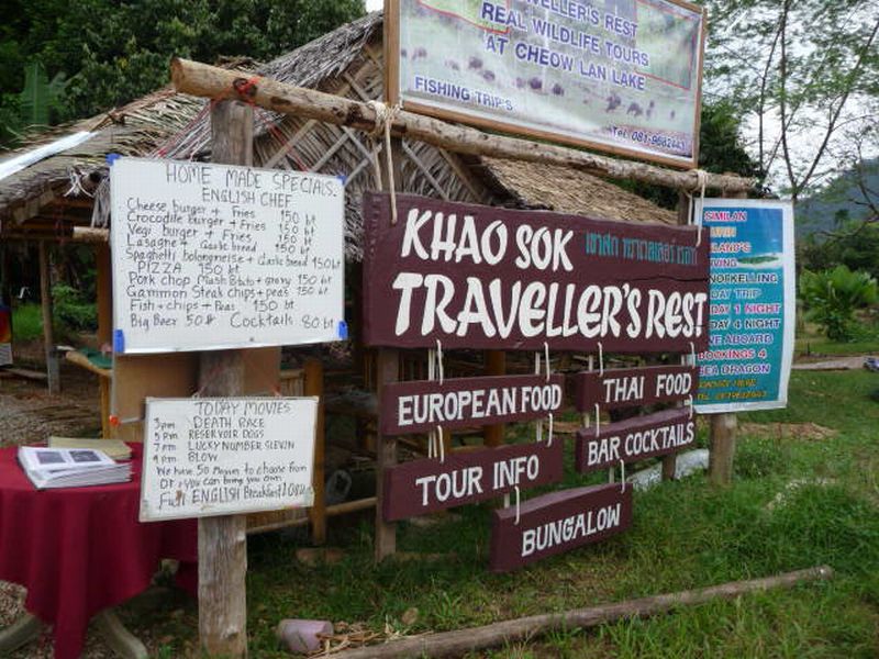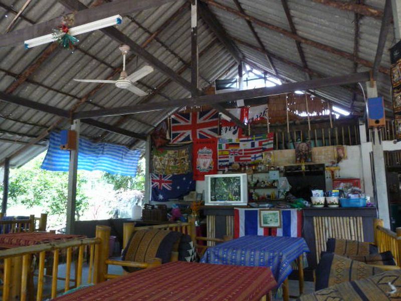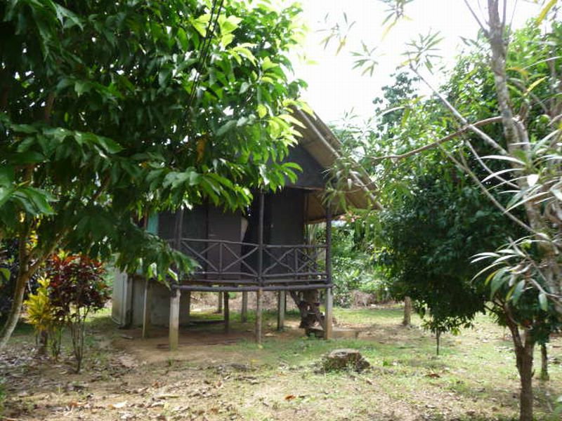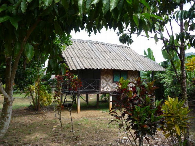 Mehrere einfache Mattenbungalows mit 2 Terrassen in einem Garten hinter dem Restaurant.