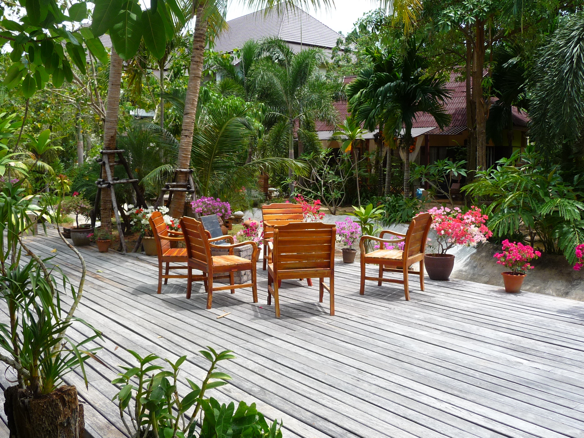 Im Garten stehen wunderschöne Holzbungalows mit vielen Stoffbahnen dekoriert.