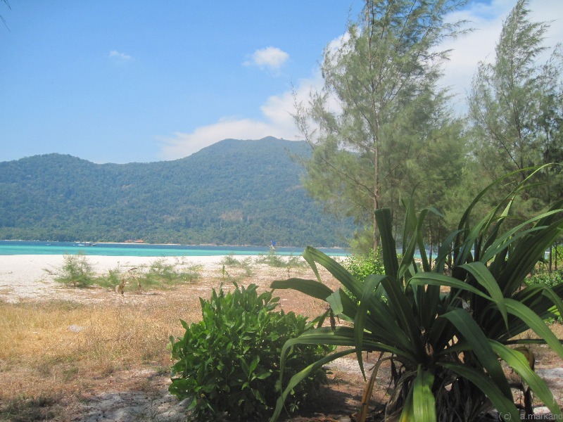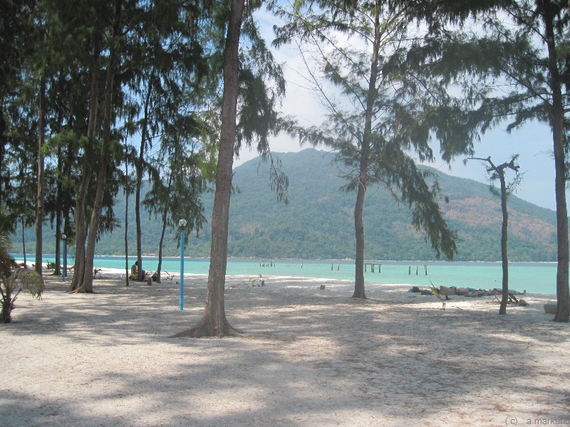 Ganz im Norden des Sunrise Beaches stehen  auf einer riesigen Fläche unter schattigen Bäumen alte Travellerhütten aus Holz mit einfachster Ausstattung.