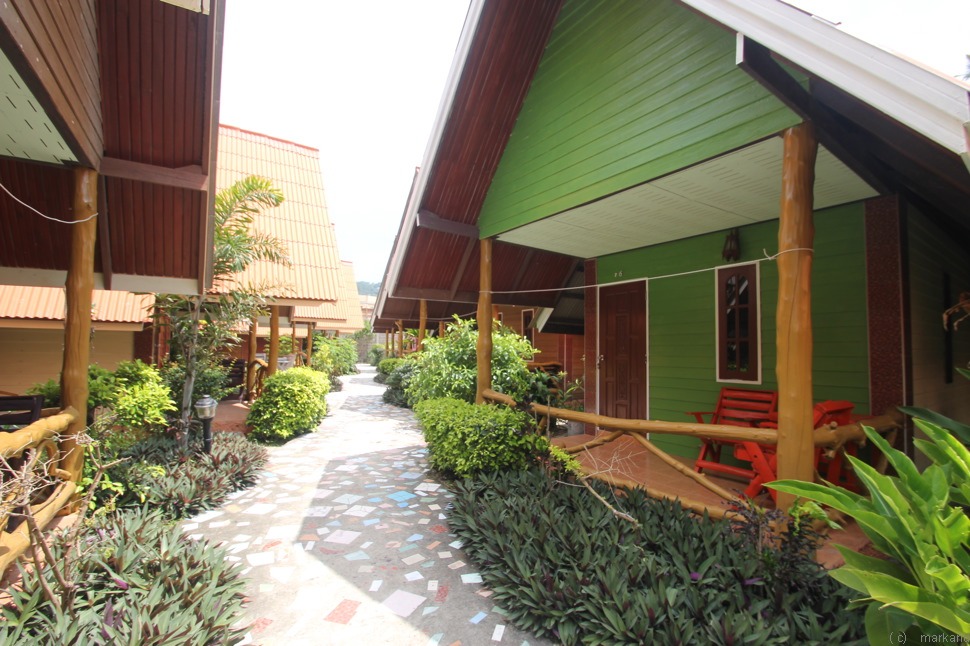 Geflieste 2-stöckige Häuser und Bungalows aus Stein und Holz. Mit Ventilator oder AC, teils mit TV.