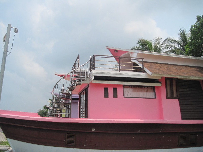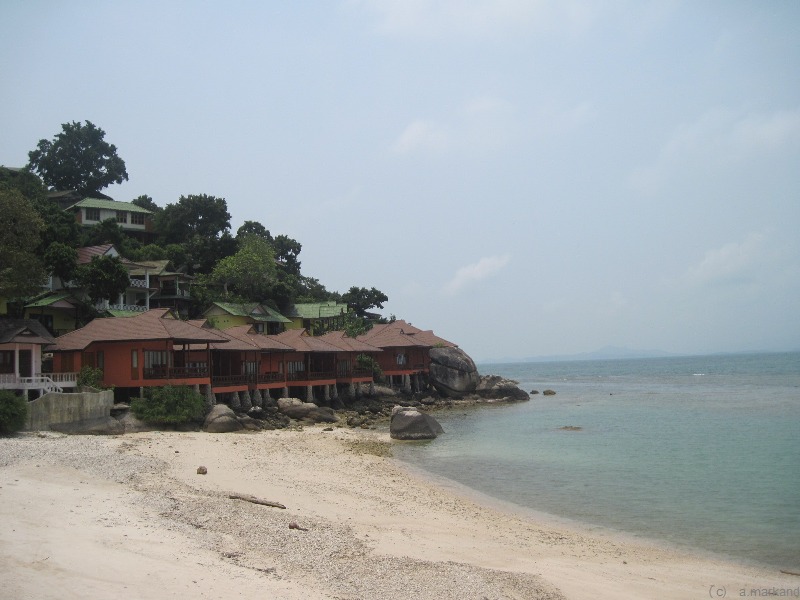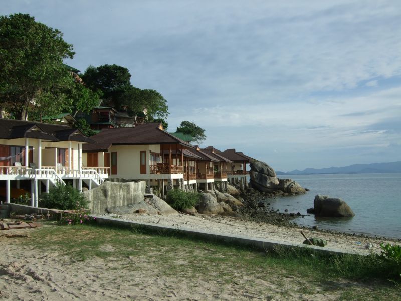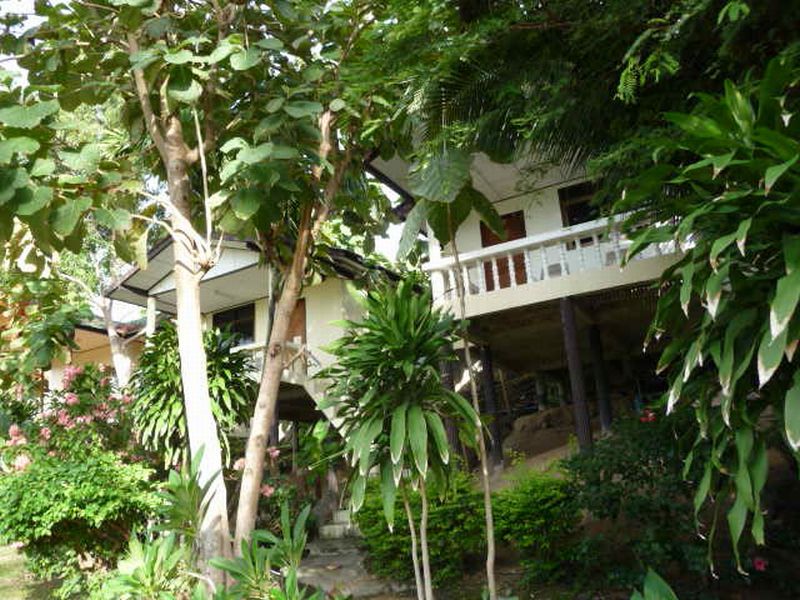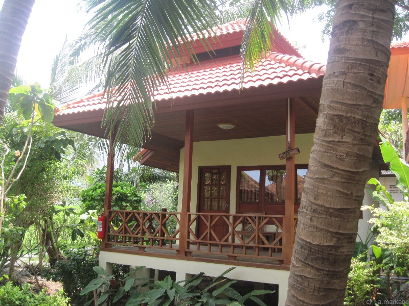 Großer Gartenbereich mit zahlreichen Bungalows, einige in Reihe, andere im Hang. Mal mit AC, mal mit Ventilator.