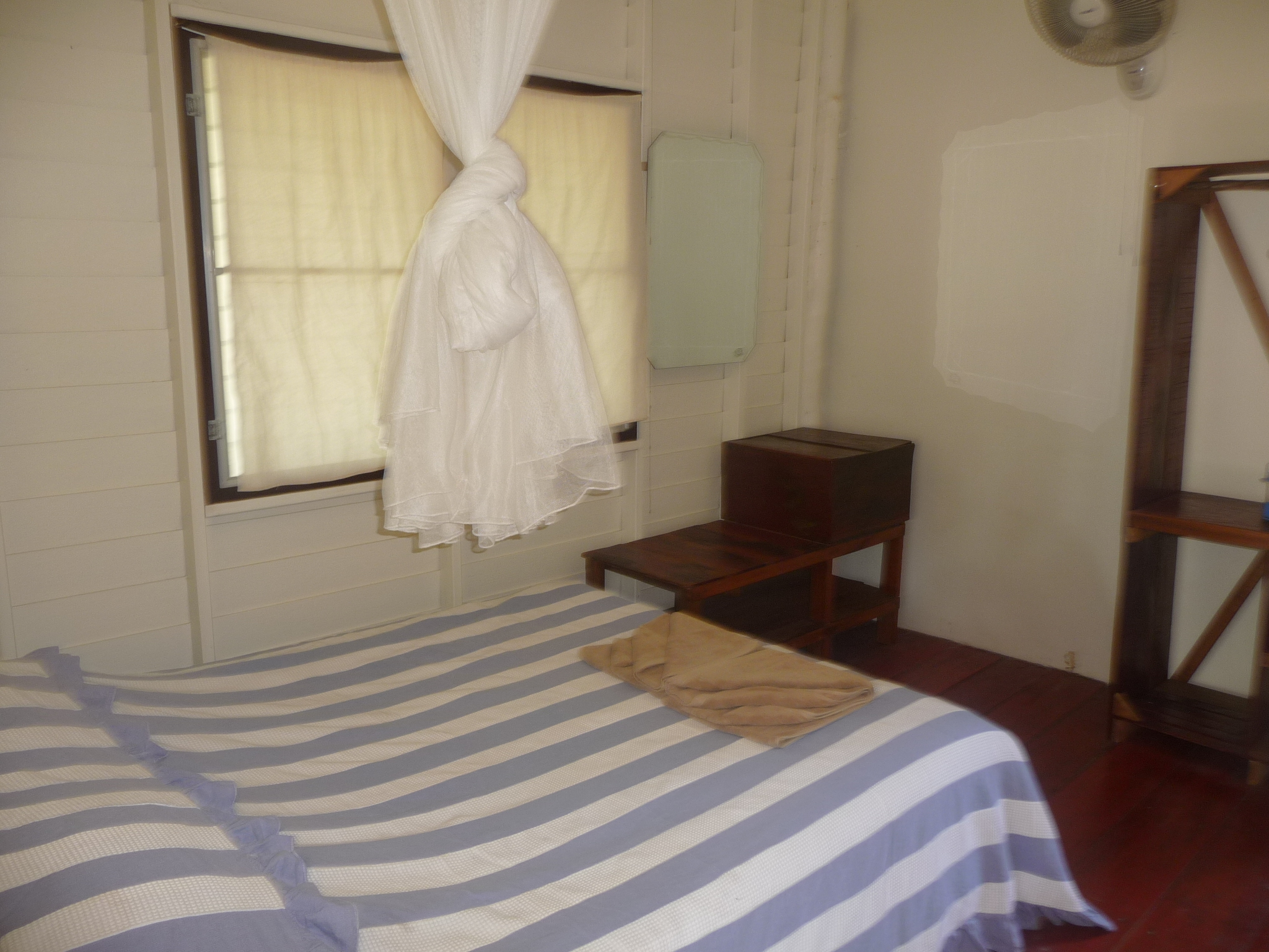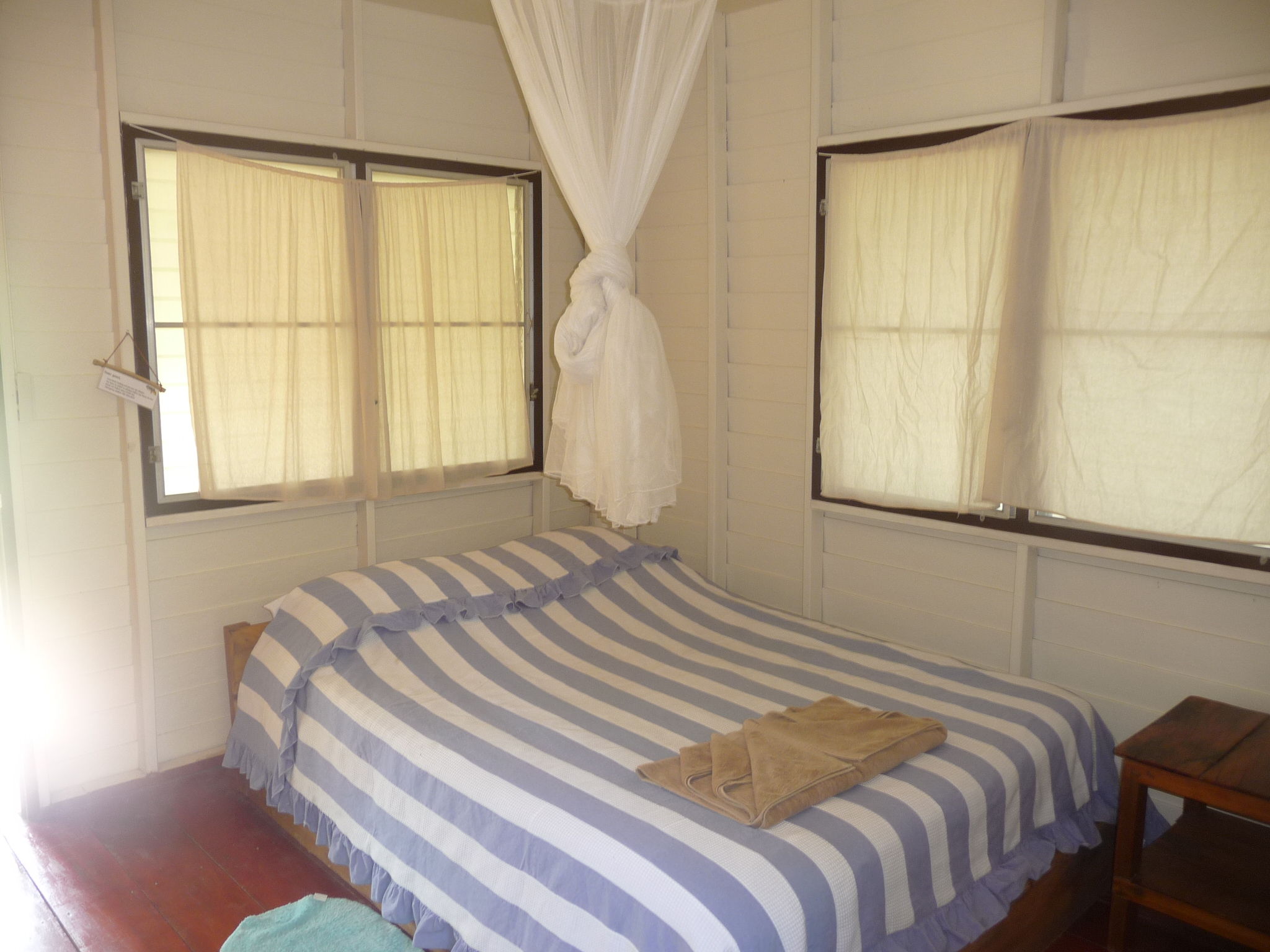 Horizontal zum Strand einfache Mattenbungalows. Dahinter befinden sich weißgetünchte Holzbungalows auf dem großzügigen Gelände. Die größeren Bungalows haben große halboffene Bäder.