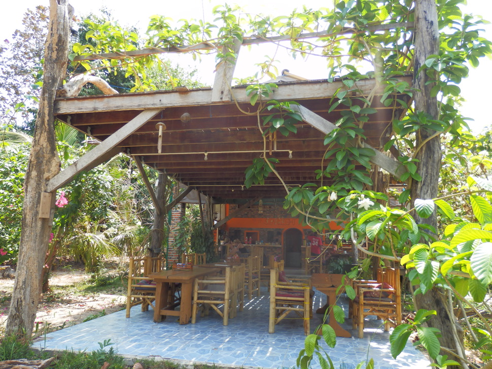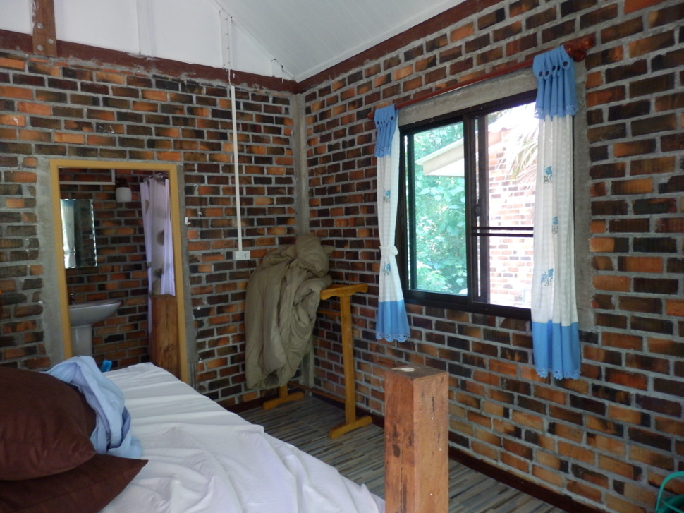 Hinter und neben dem Restaurant stehen kleine günstige und große gut eingerichtete Bungalows. Weiter hinten Bungalows aus rotem Backstein.