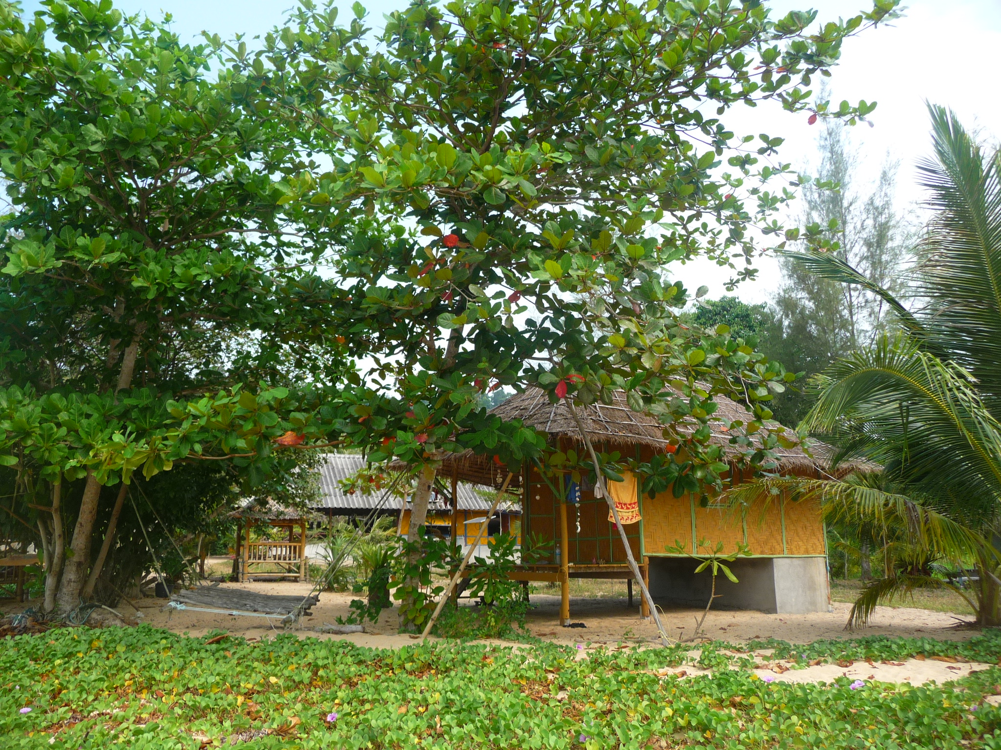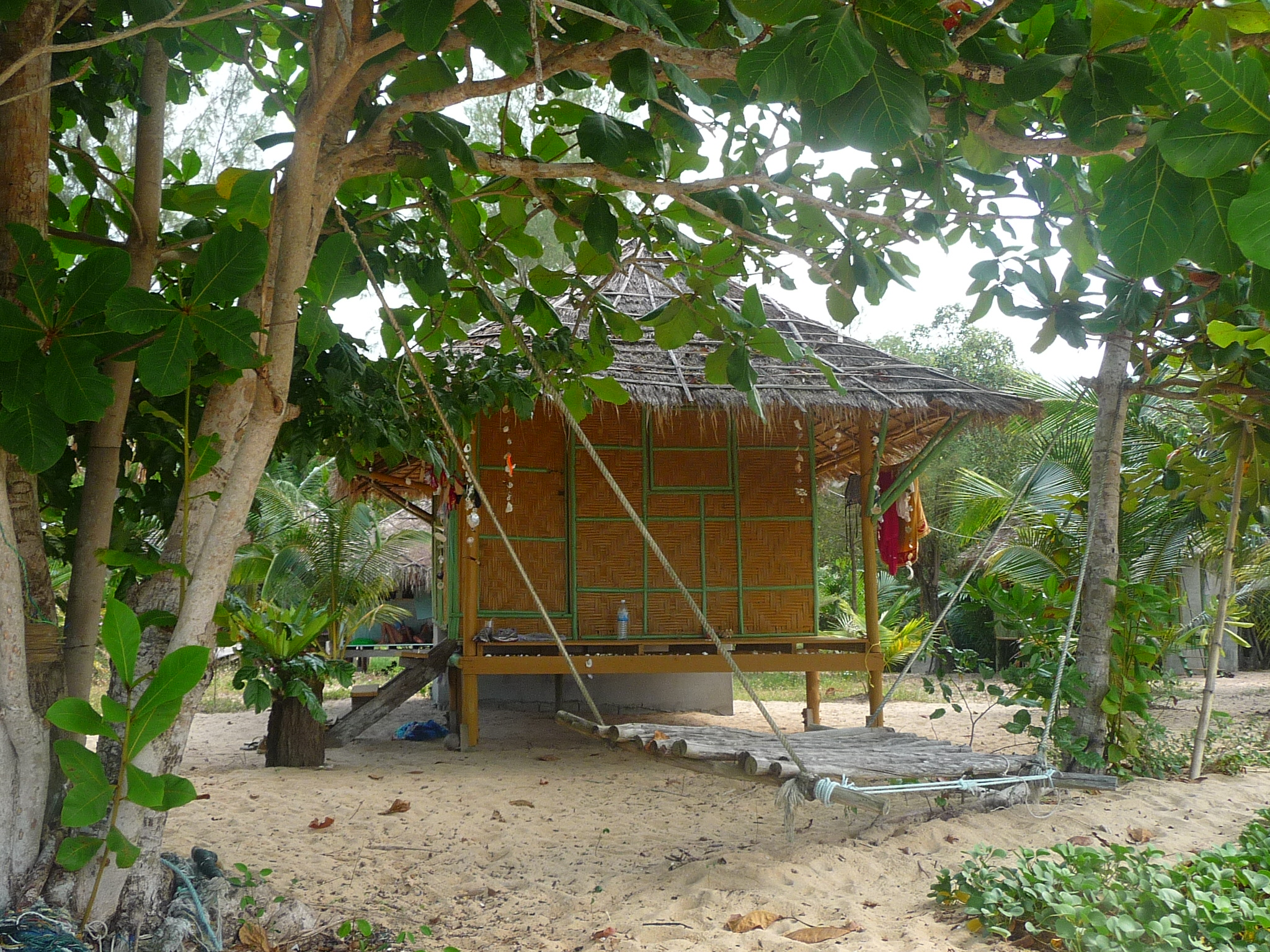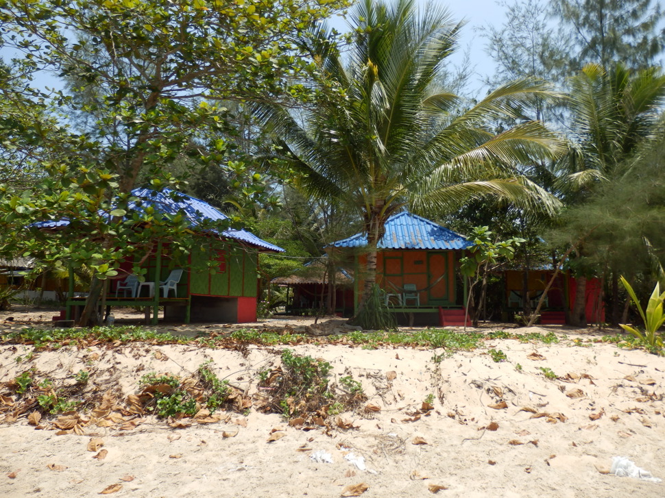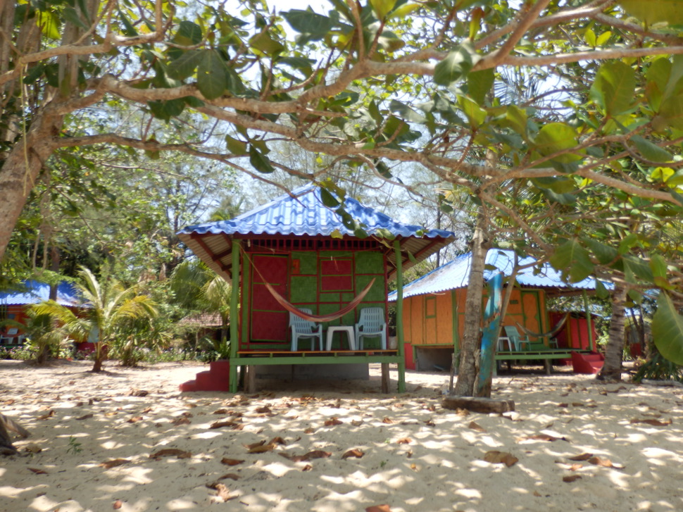 Direkt am Strad neben einem Klong und nahe der Hippie Bar stehen bunte Hütten aus Holz und Matte auf einem sandigen, baumbewachsenen Gelände.