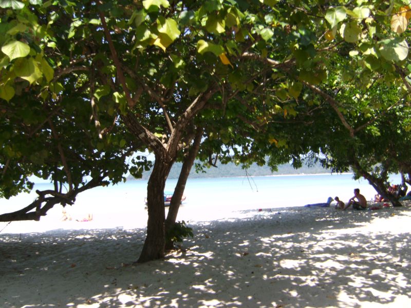 Vorsicht: vor den Hütten gibt es schattenspendende Bäume, am Wasser kein Schatten.