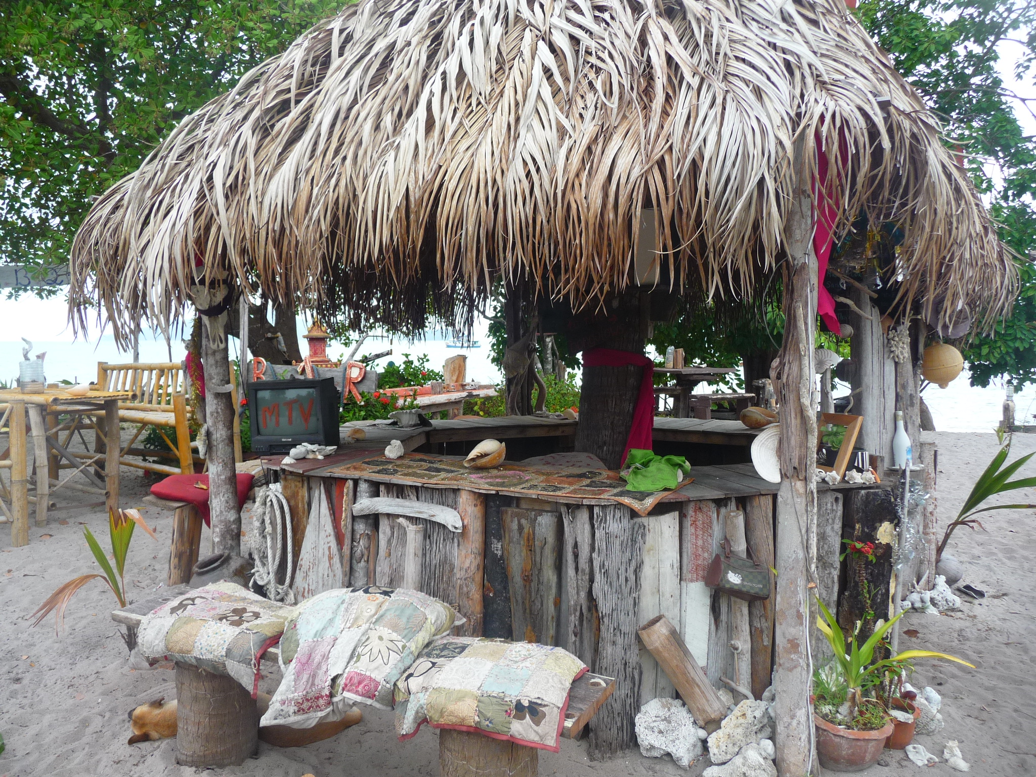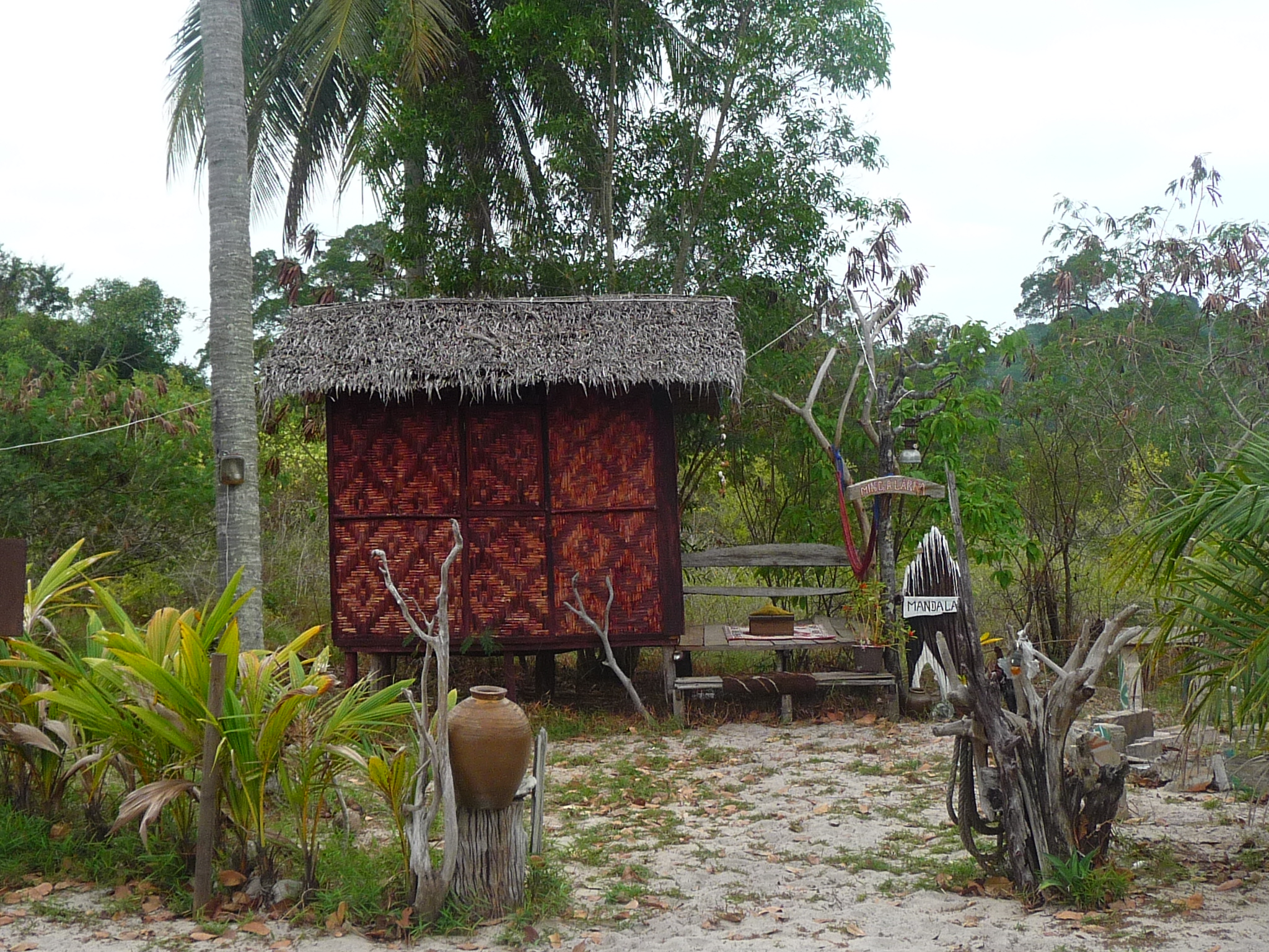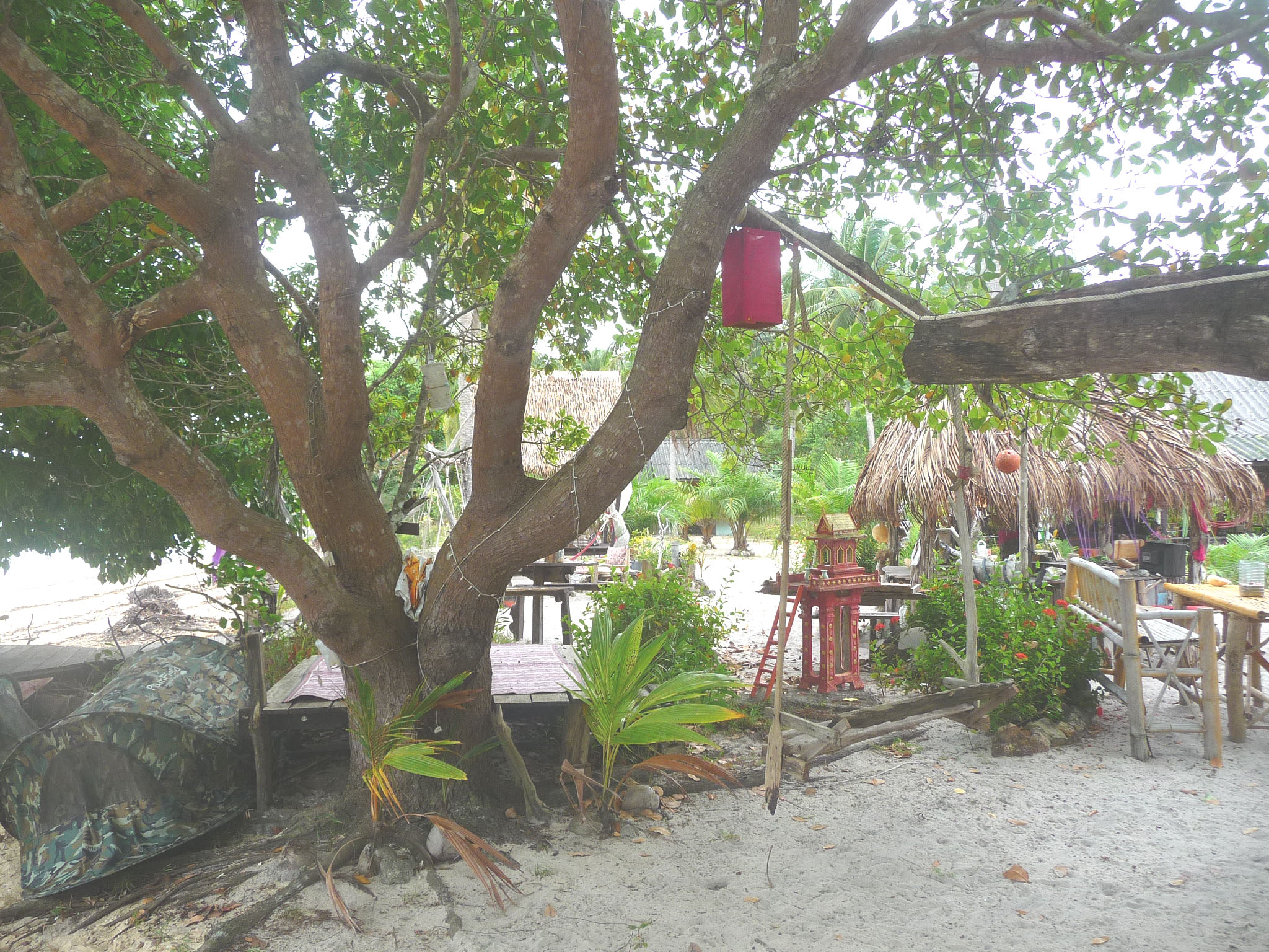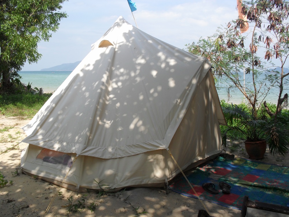Wer mag, kann sein Zelt aufstellen oder eines der beiden Zelte der Anlage am Strand beziehen (diese sind überdacht, so dass es auch bei Regen ok ist ier zu wohnen und auch starker Sonnenschein das Zelt nicht zu stark aufheizt.