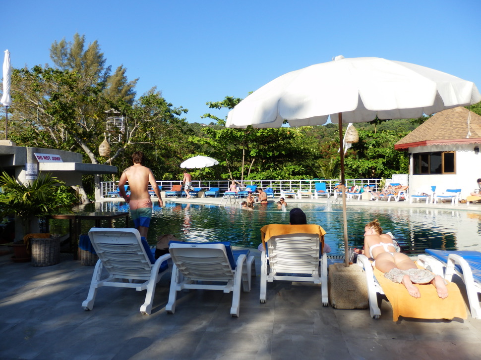Großer Pool. Partyzone ab morgens bis tief in die Nacht. 1800 Baht für Bambushütte, Zimmer  ab 2000 Baht.