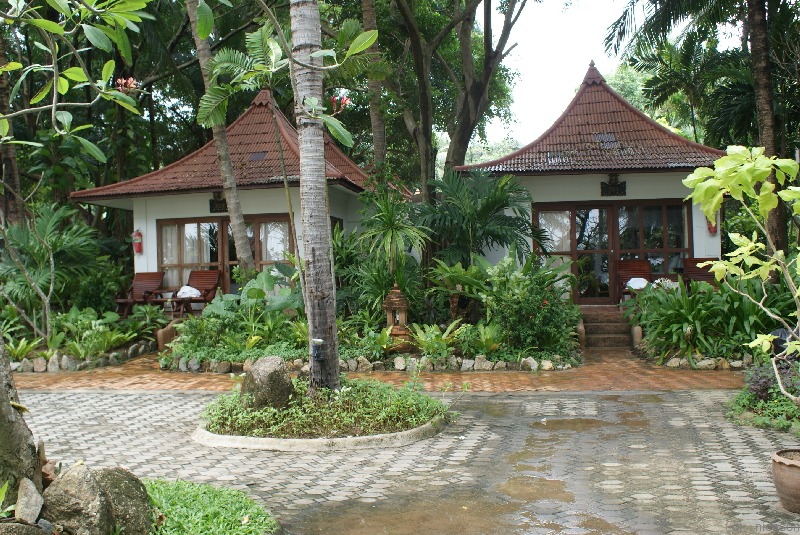 In einem schattigen, von Palmen bestandenen Garten, stehen schöne Bungalows aus Stein.
