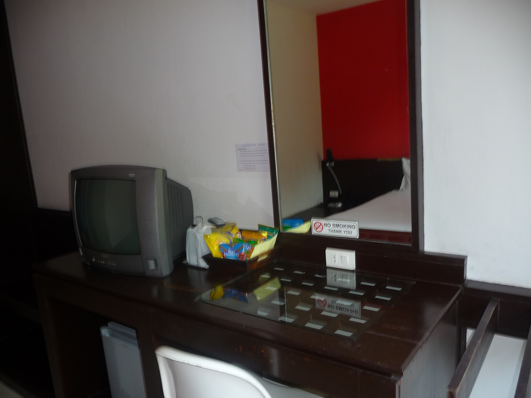 Über einer Ladenzeile: Große Zimmer, ebensolche Betten. Dazu TV und Kühlschrank. Gekühlt mit AC.
