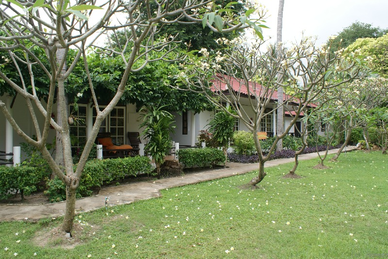 Im großen Garten verteilt stehen ansprechende Steinbungalwos mit AC.
