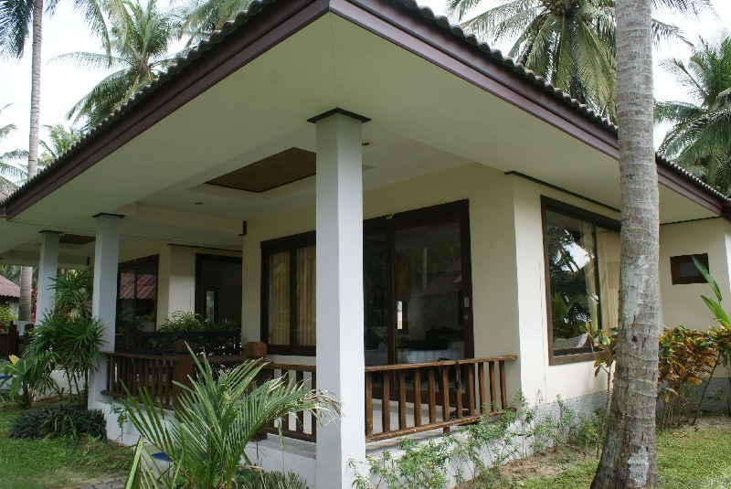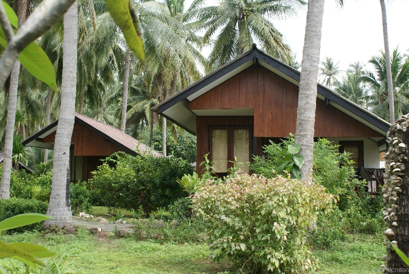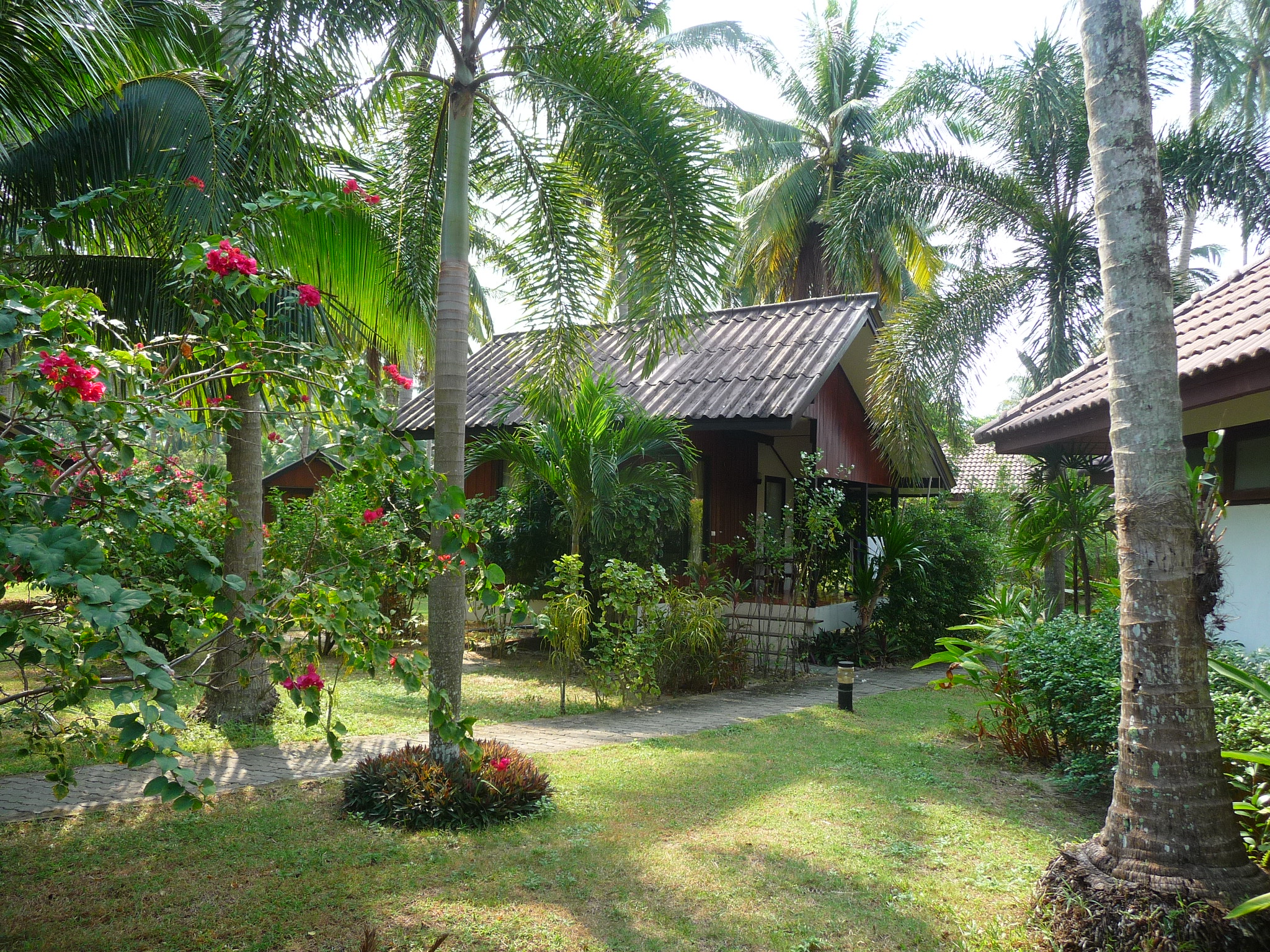 Schöne Stein- und Holzbungalows im Garten mit angenehmen Zimmern.