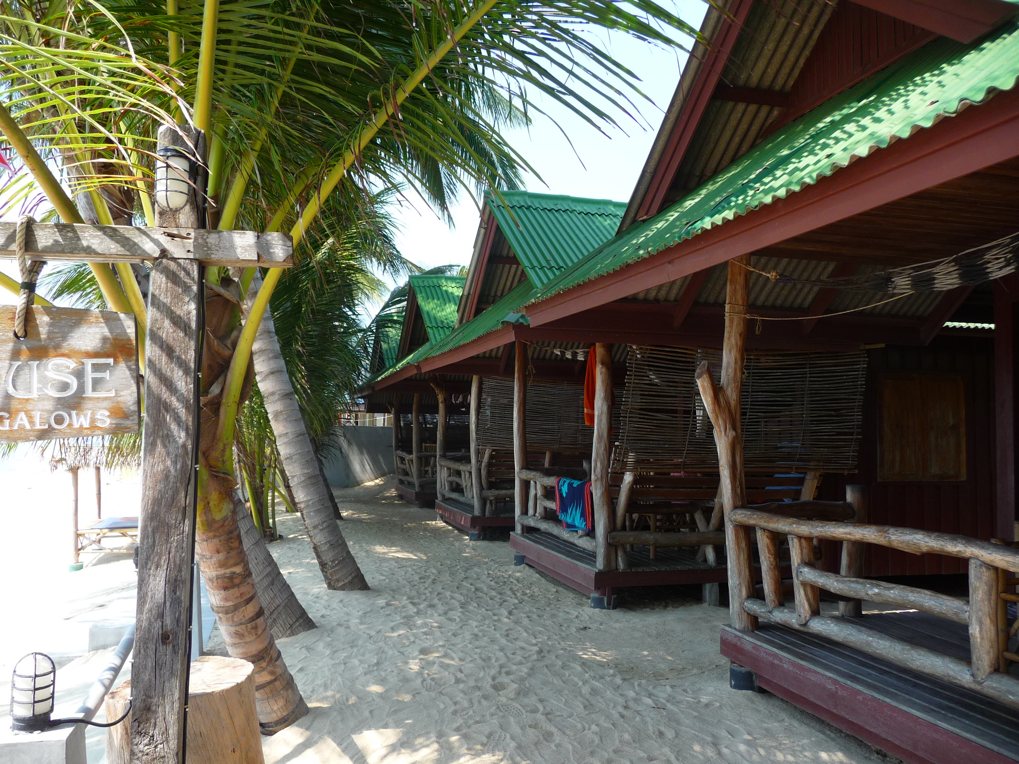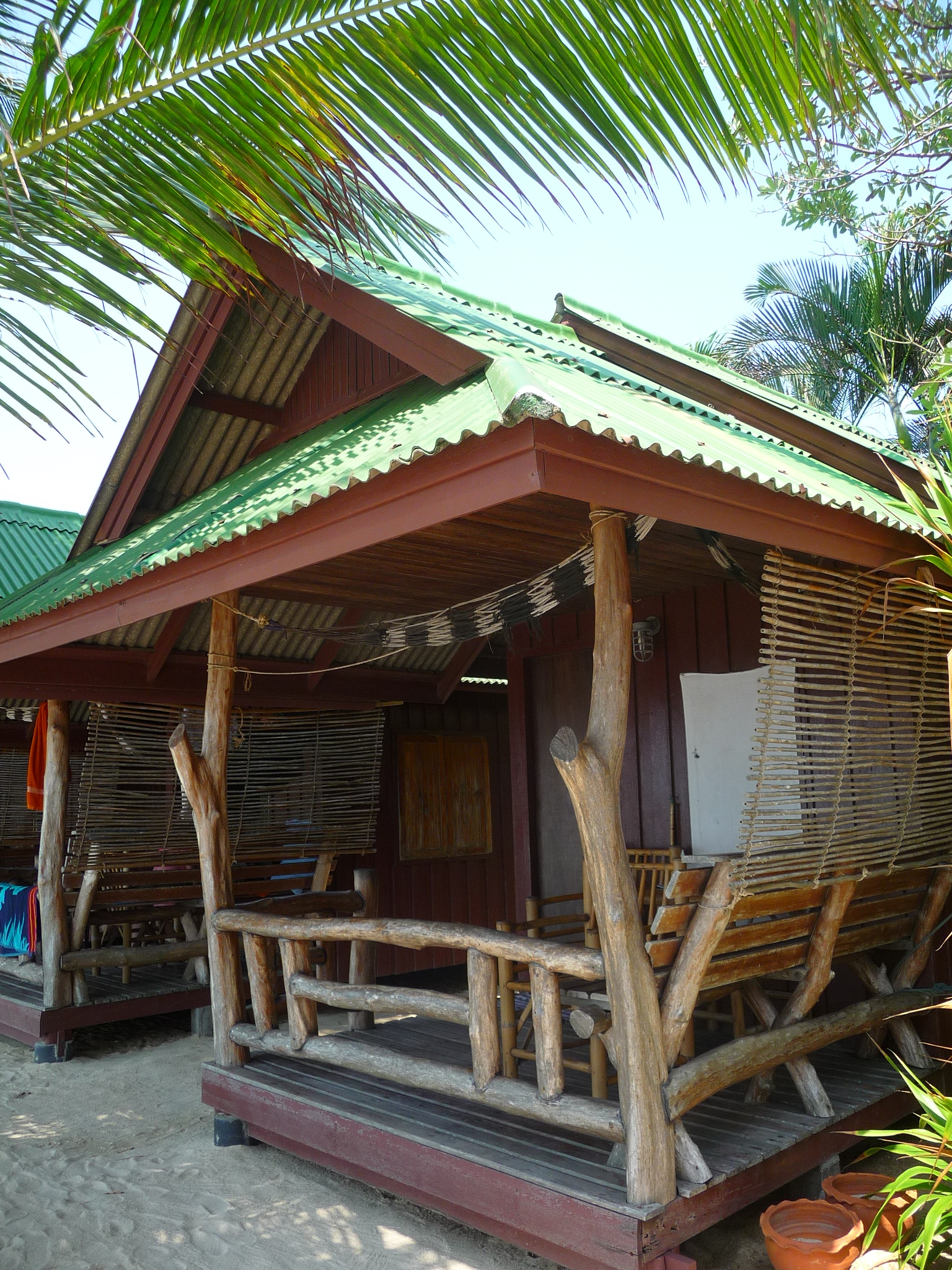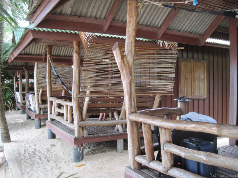 Holzbungalows mit Ventilator am Strand - Sichtschutz durch Pflanzen.