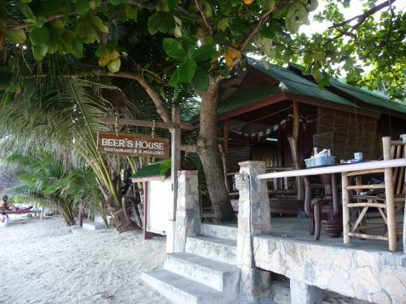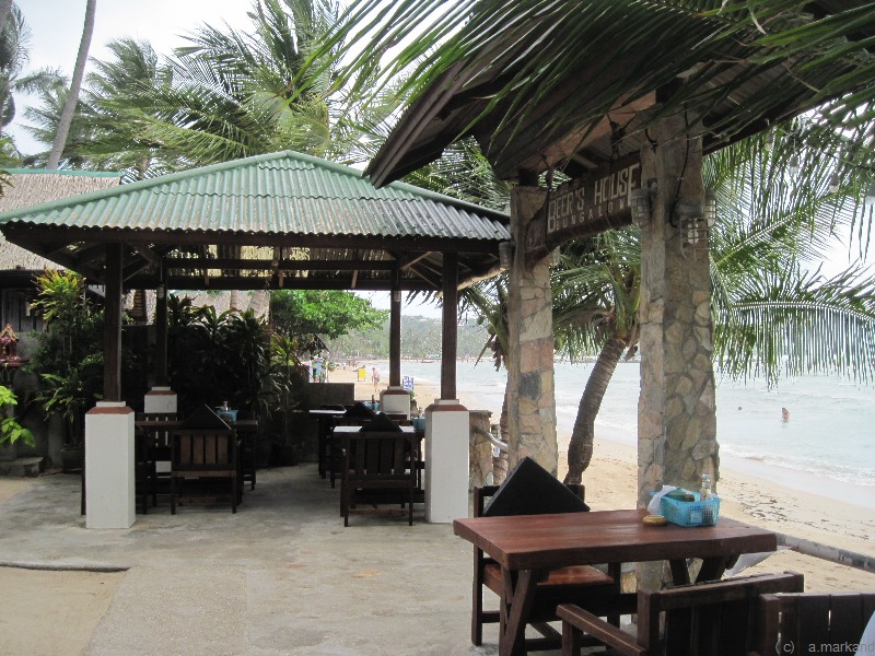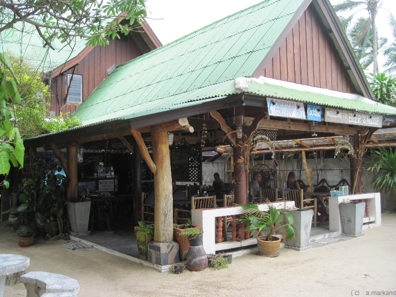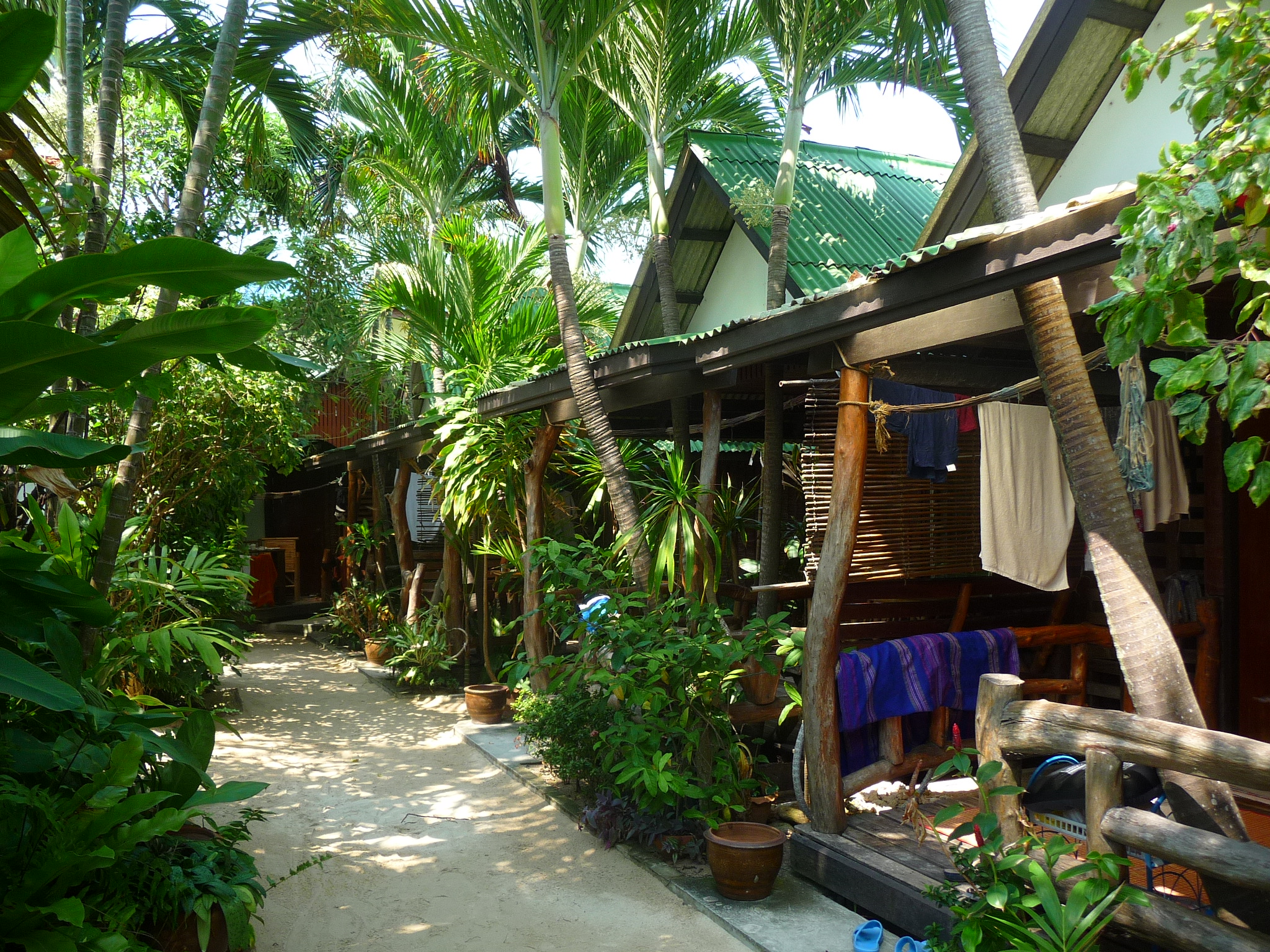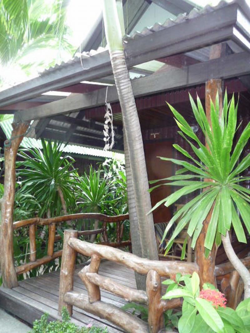 Holzbungalows mit Ventilator am Strand - Sichtschutz durch Pflanzen.