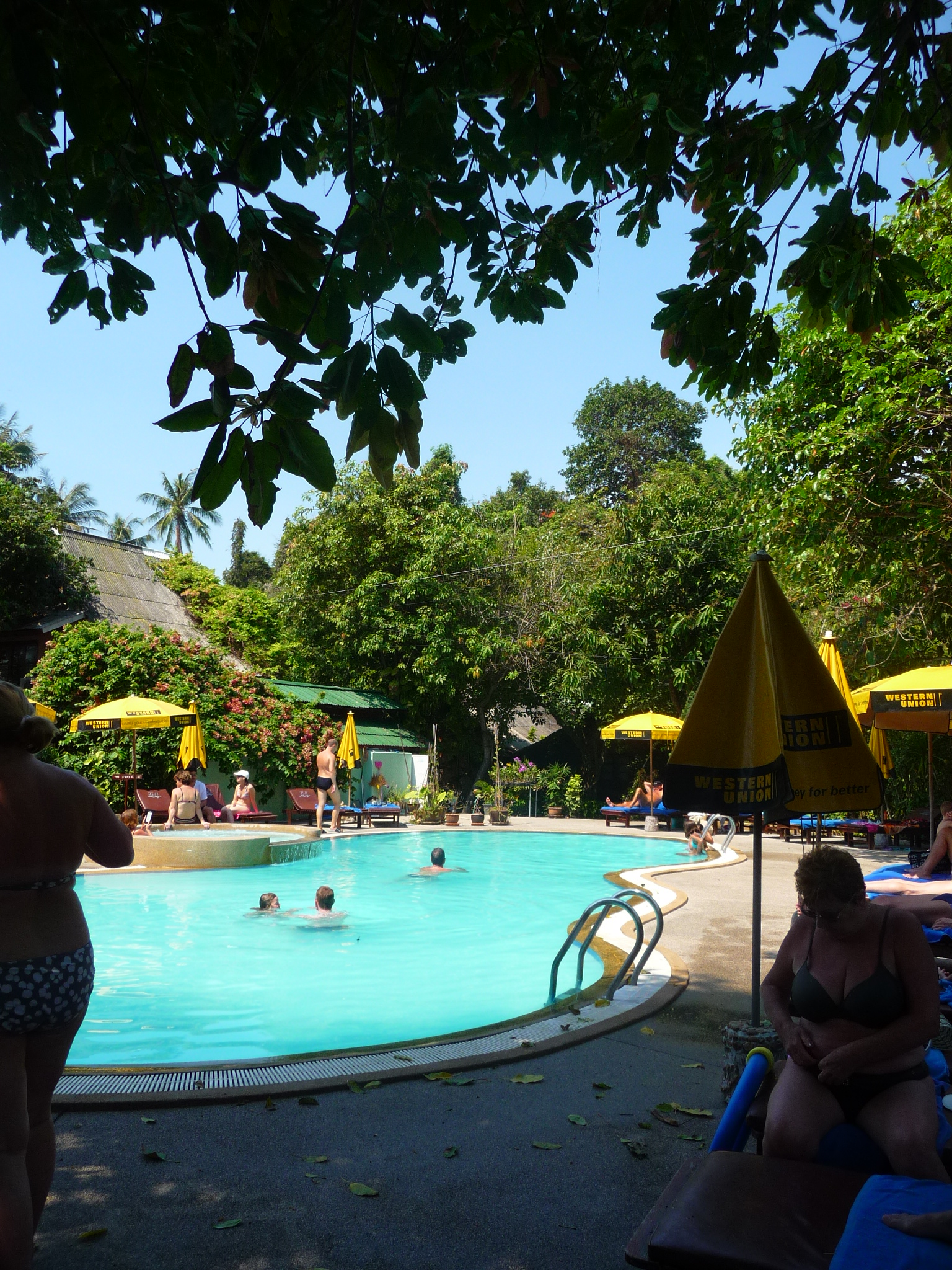 Der Pool hat einen Kinderbereich und wird von vielen Pflanzen umstanden.