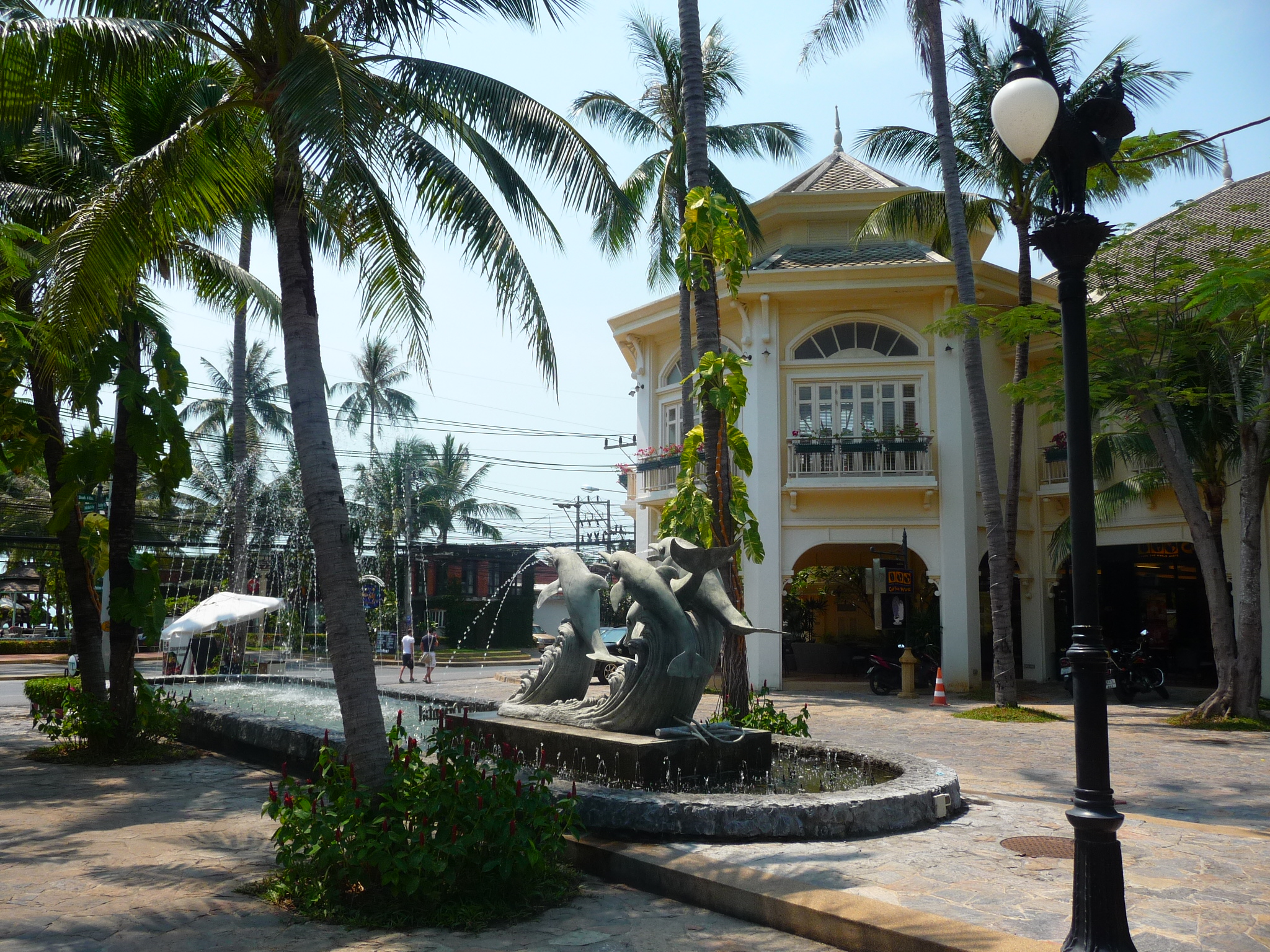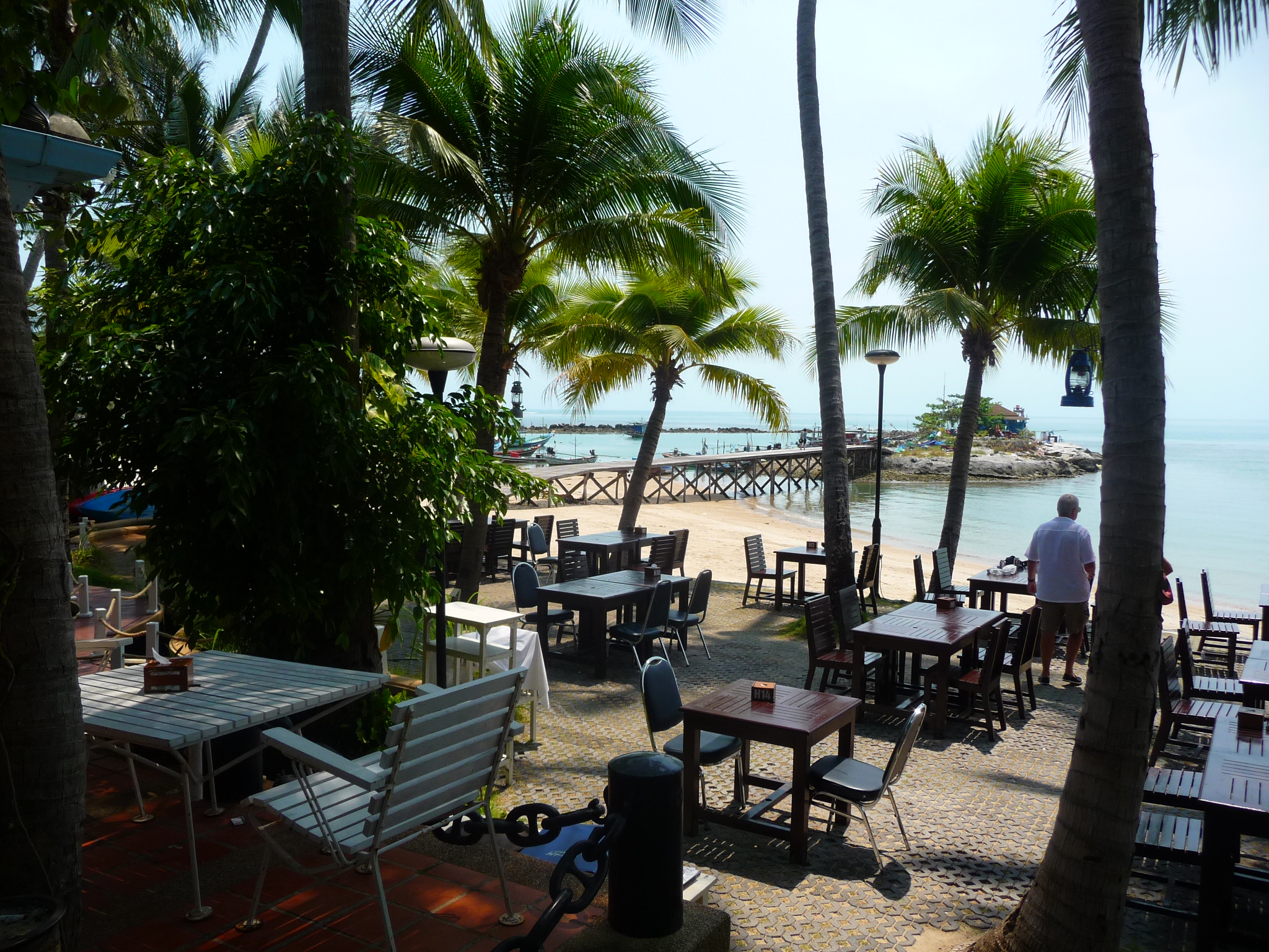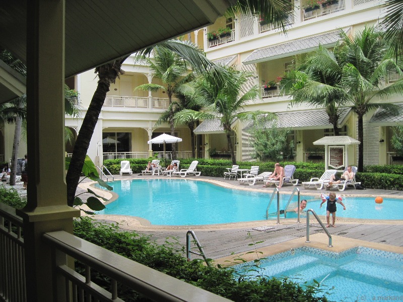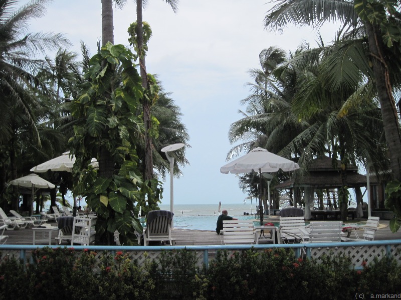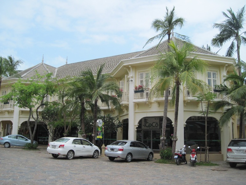 Vorne am Strand befindet sich ein großer Pool. Über die Straße erreicht man das Eingangsgelände, gesäumt von Cafés, Schneidern und einem Kindergarten.