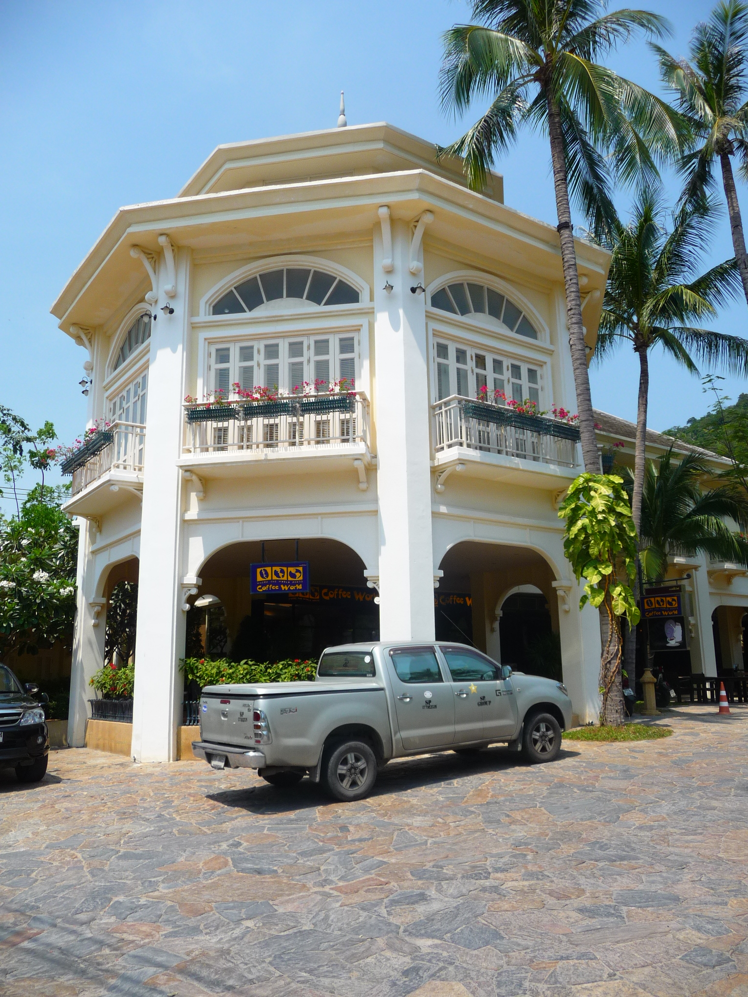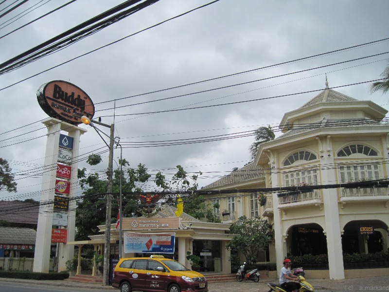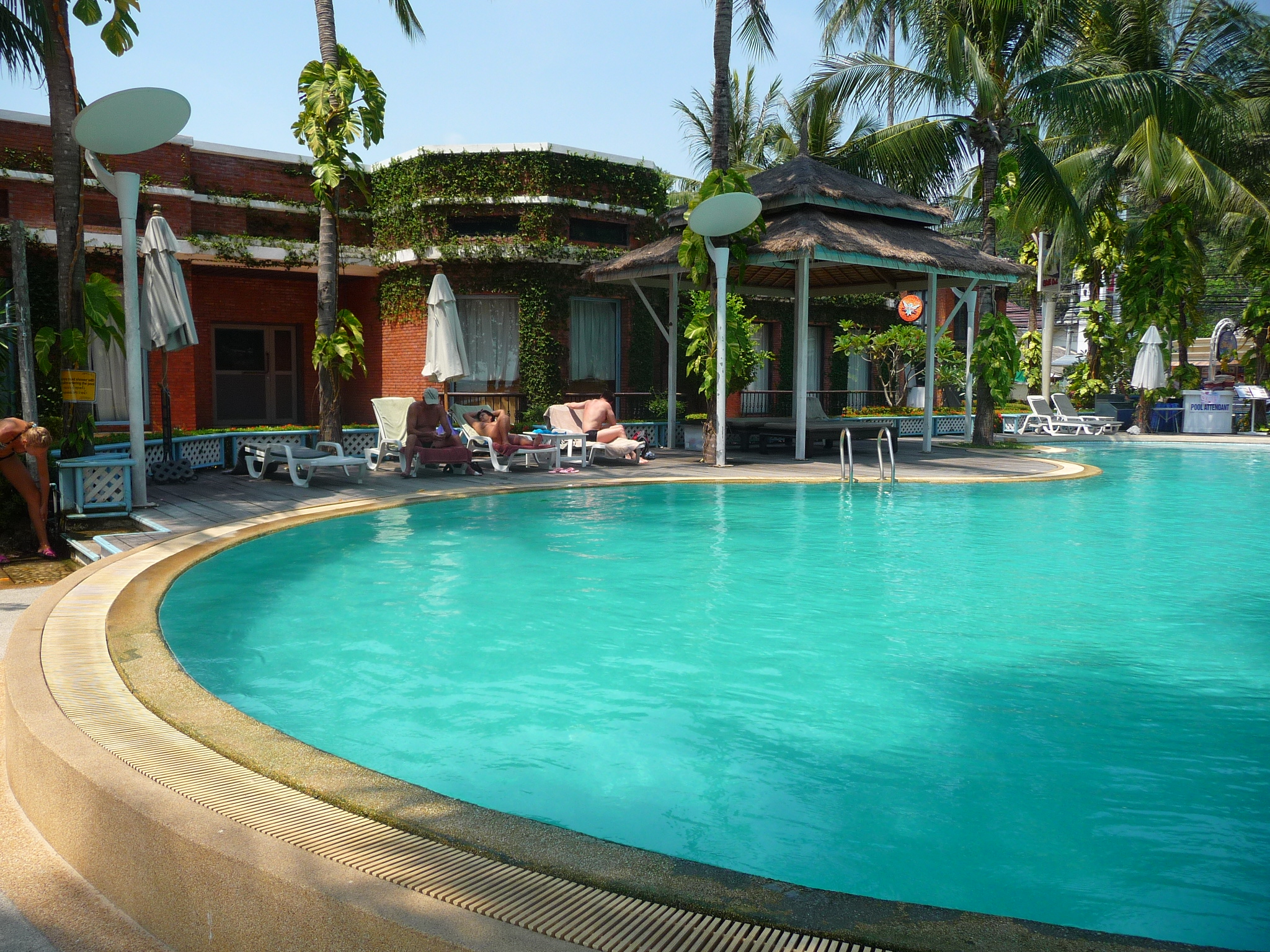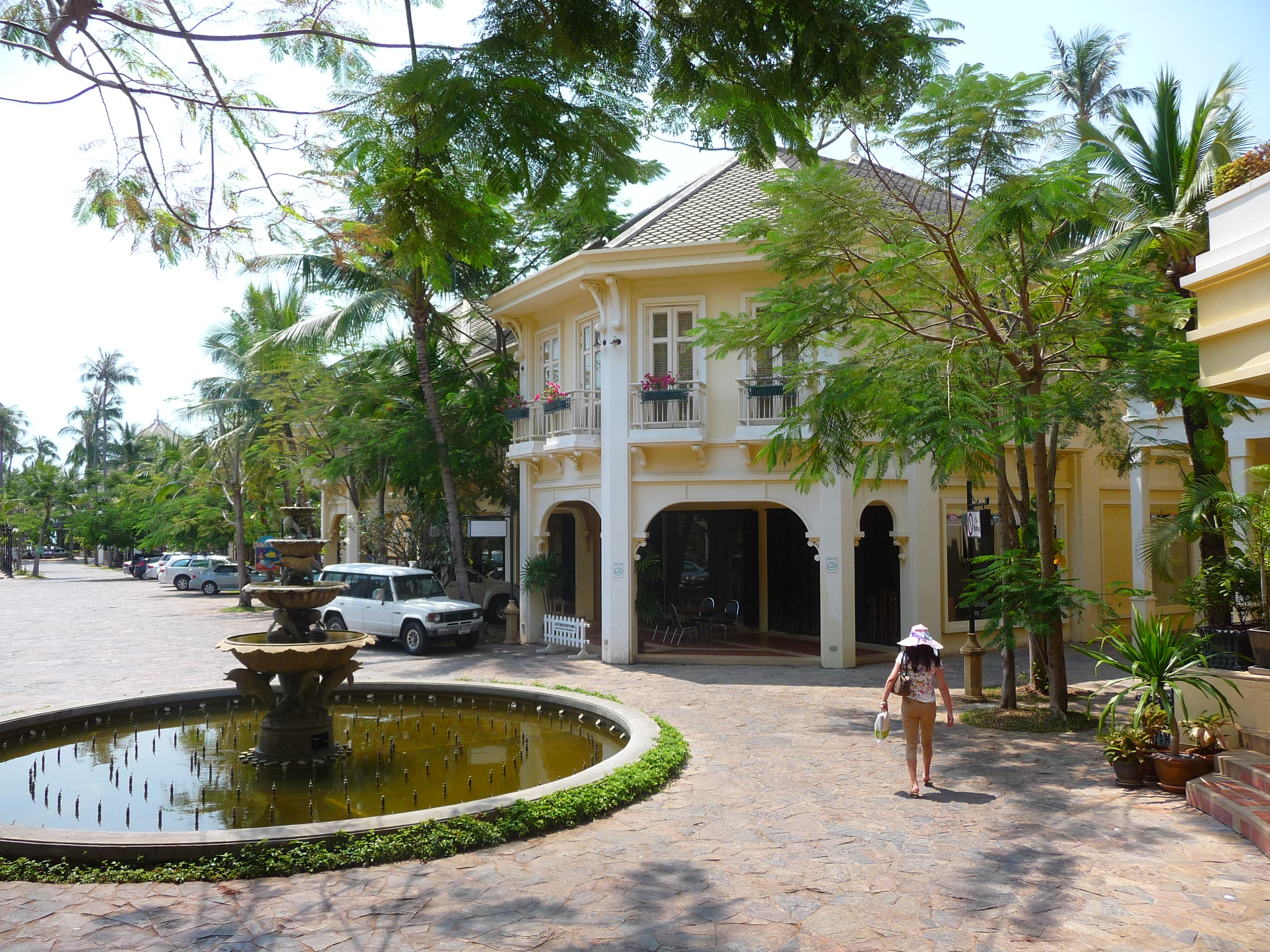 Vorne am Strand befindet sich ein großer Pool. Über die Straße erreicht man das Eingangsgelände, gesäumt von Cafés, Schneidern und einem Kindergarten.