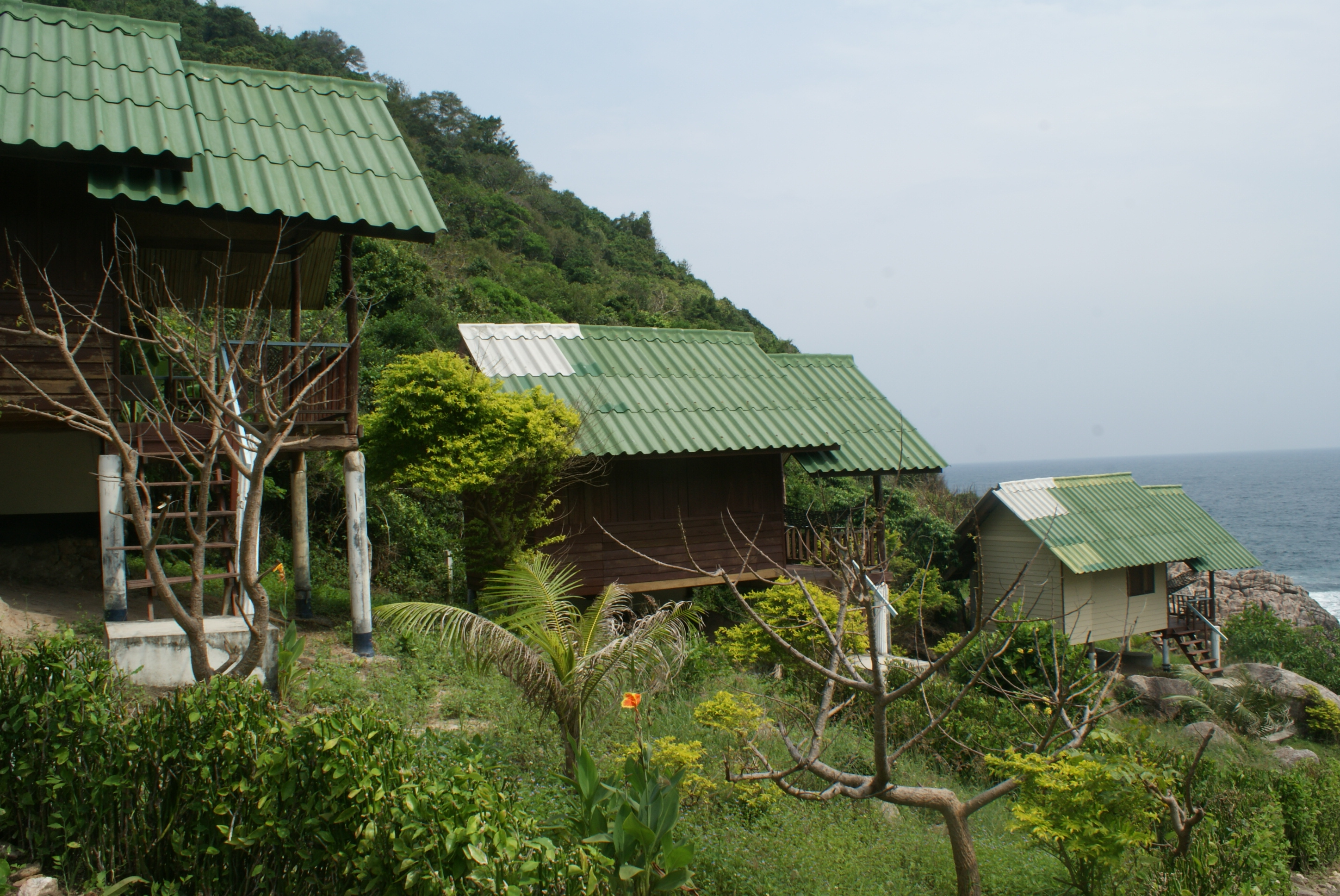 Einfache, günstige Hütten aus Holz am weitläufigen Grundstück.