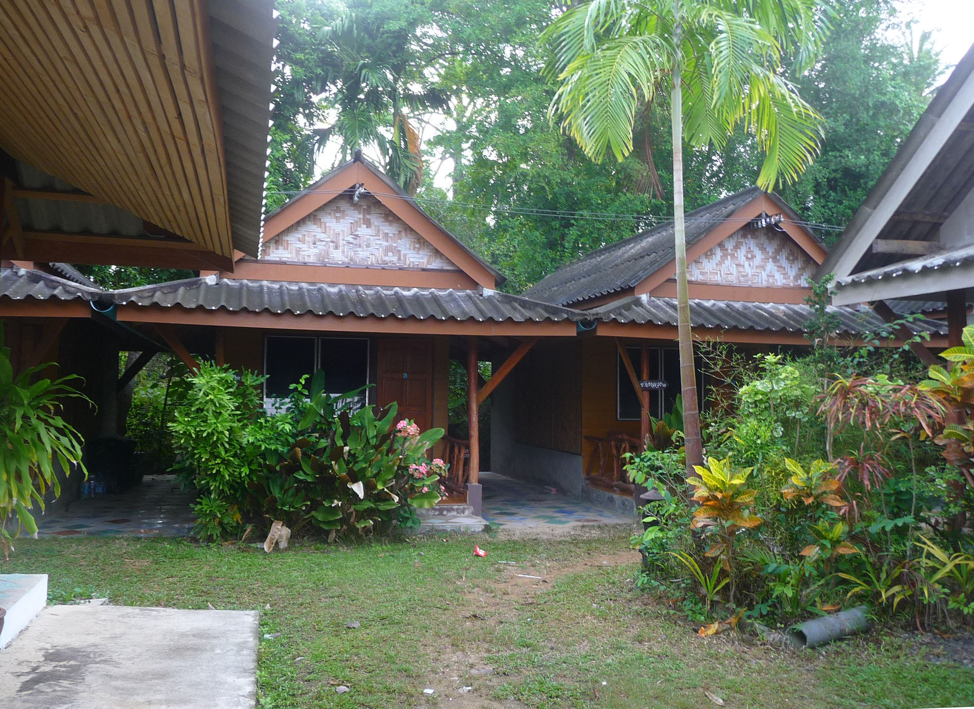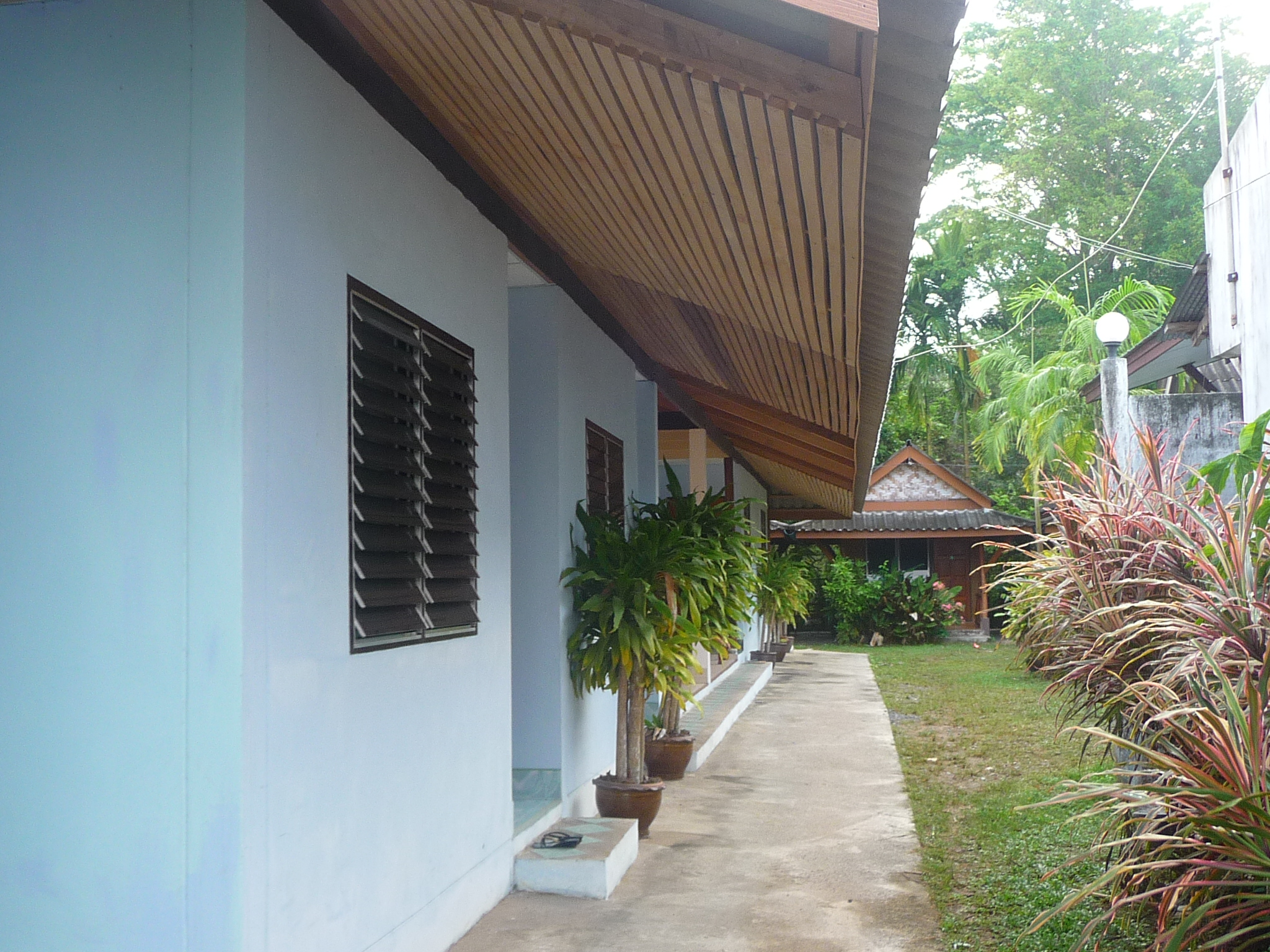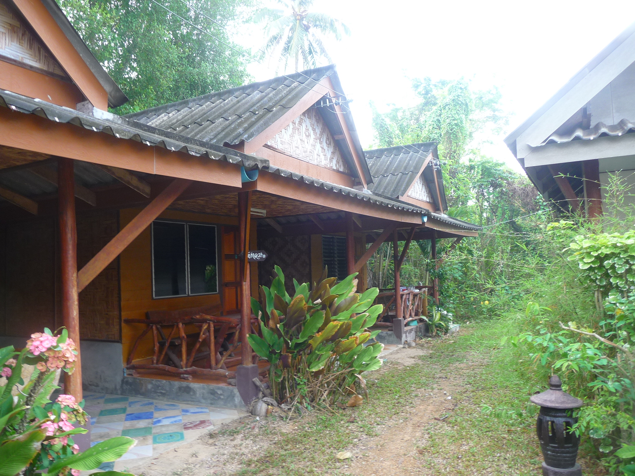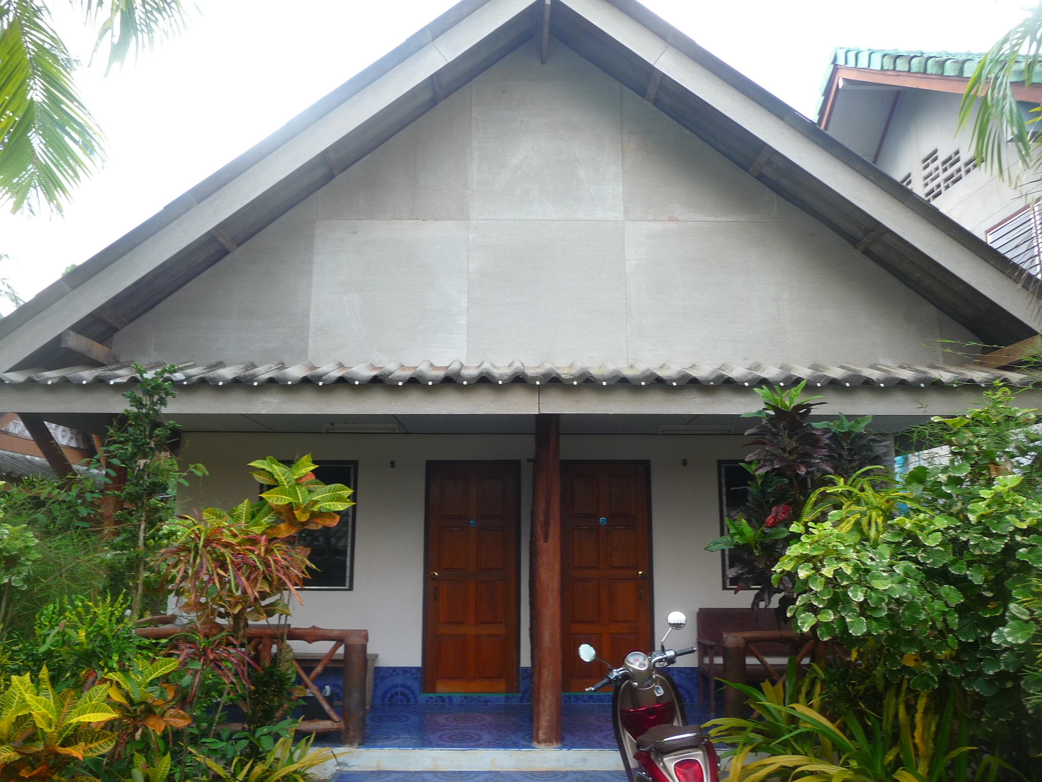 Einfache Bungalows mit Ventilator in L-Form angeordnet, in einem kleinen Garten.