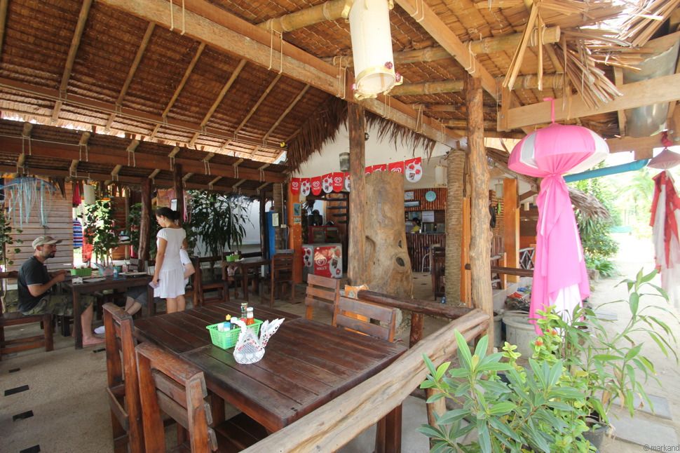 Restaurant und Bungalows unter Palmen